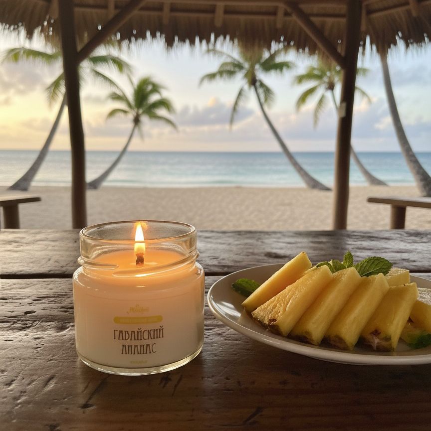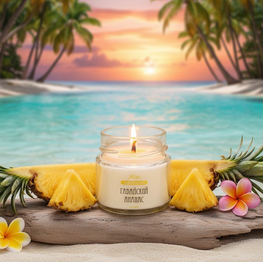 Позвольте себе немного экзотики! Зажгите свечу, закройте глаза и позвольте себе перенестись на Гавайи. Как вам такой способ путешествовать, не выходя из дома? Верхние ноты ананаса, персика и острого грейпфрута сливаются с тропической маракуйей, манго и кокосом. Ноты пикантного лемонграсса и мускуса завершают этот фруктовый аромат. 100% натуральный соевый воск и эфирные масла, включая апельсин (сладкий), сосну, бутон гвоздики, лайм, цитронеллу и петитгрейн.