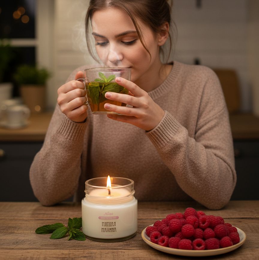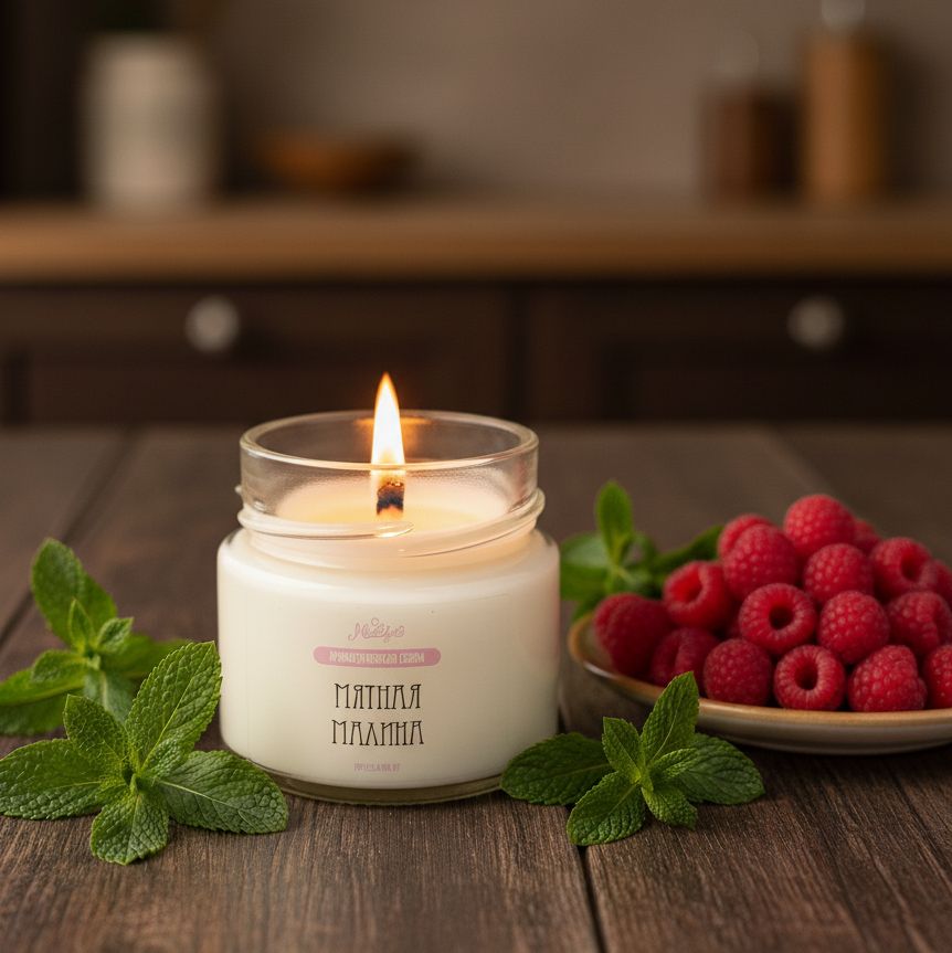"Мятная малина" представляет собой освежающую и бодрящую композицию, сочетающую в себе сладкие, сочные и фруктовые ноты спелой малины с прохладной, тонизирующей свежестью мяты. Этот аромат вызывает ассоциации с летней легкостью, создает ощущение прохладного ветерка и наполняет энергией, поднимая настроение.