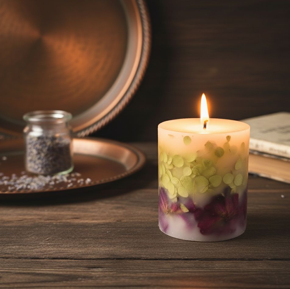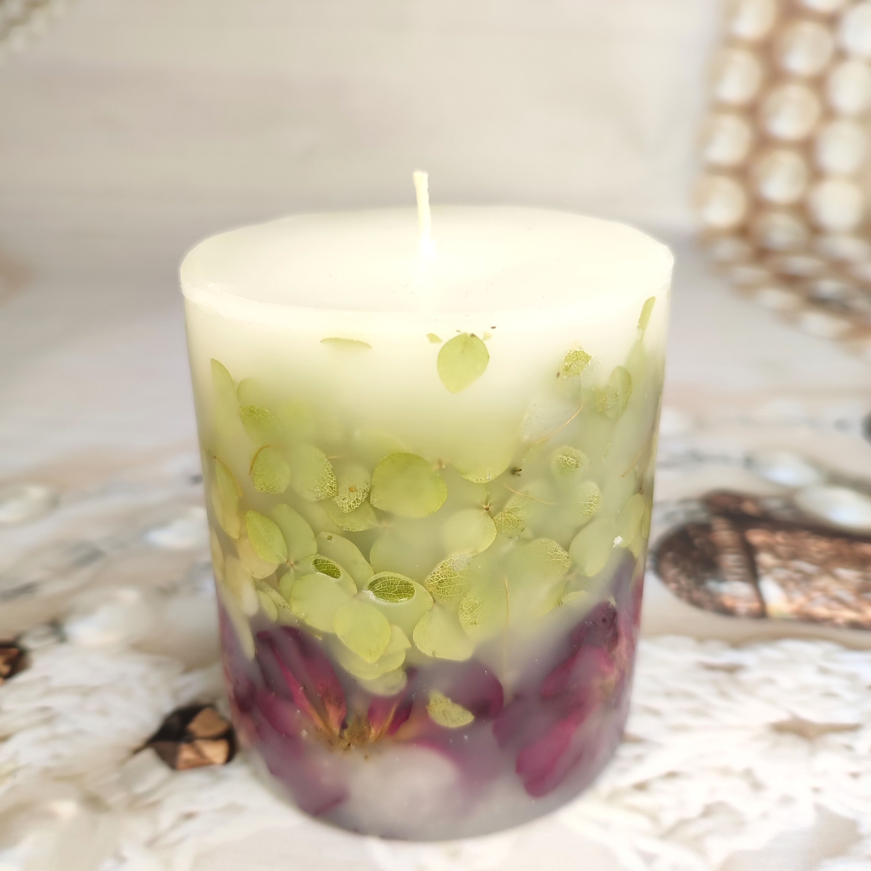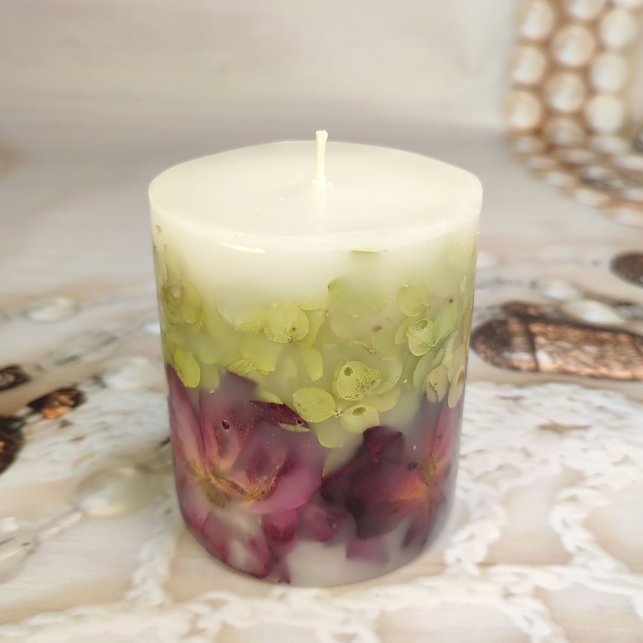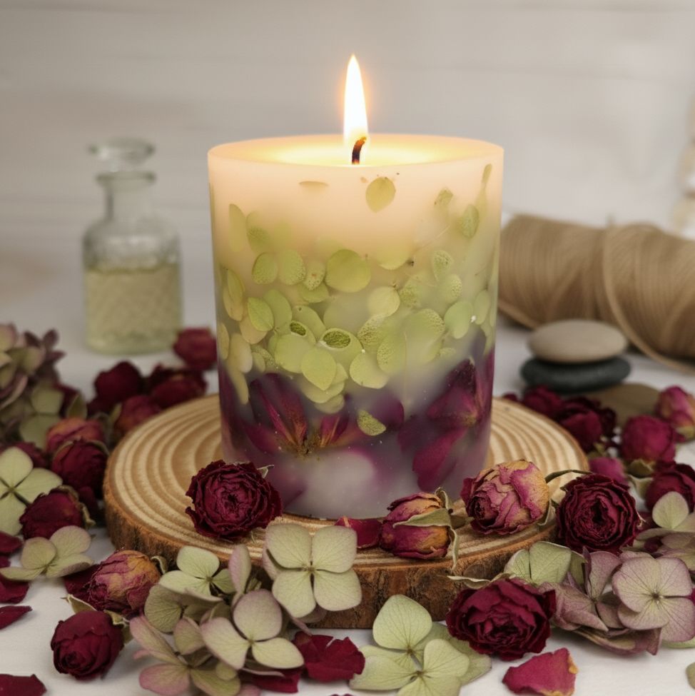 Ботаническая свеча, украшенная бутонами роз и лепестками гортензии.