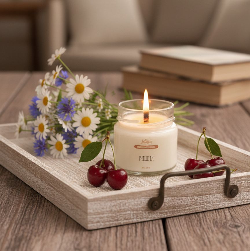 Эта свеча - настоящее воплощение лета: сочная, спелая вишня в сочетании с терпкими нотками вишневой косточки. Ощутите настоящий, глубокий и долгоиграющий аромат, который преобразит ваше пространство.