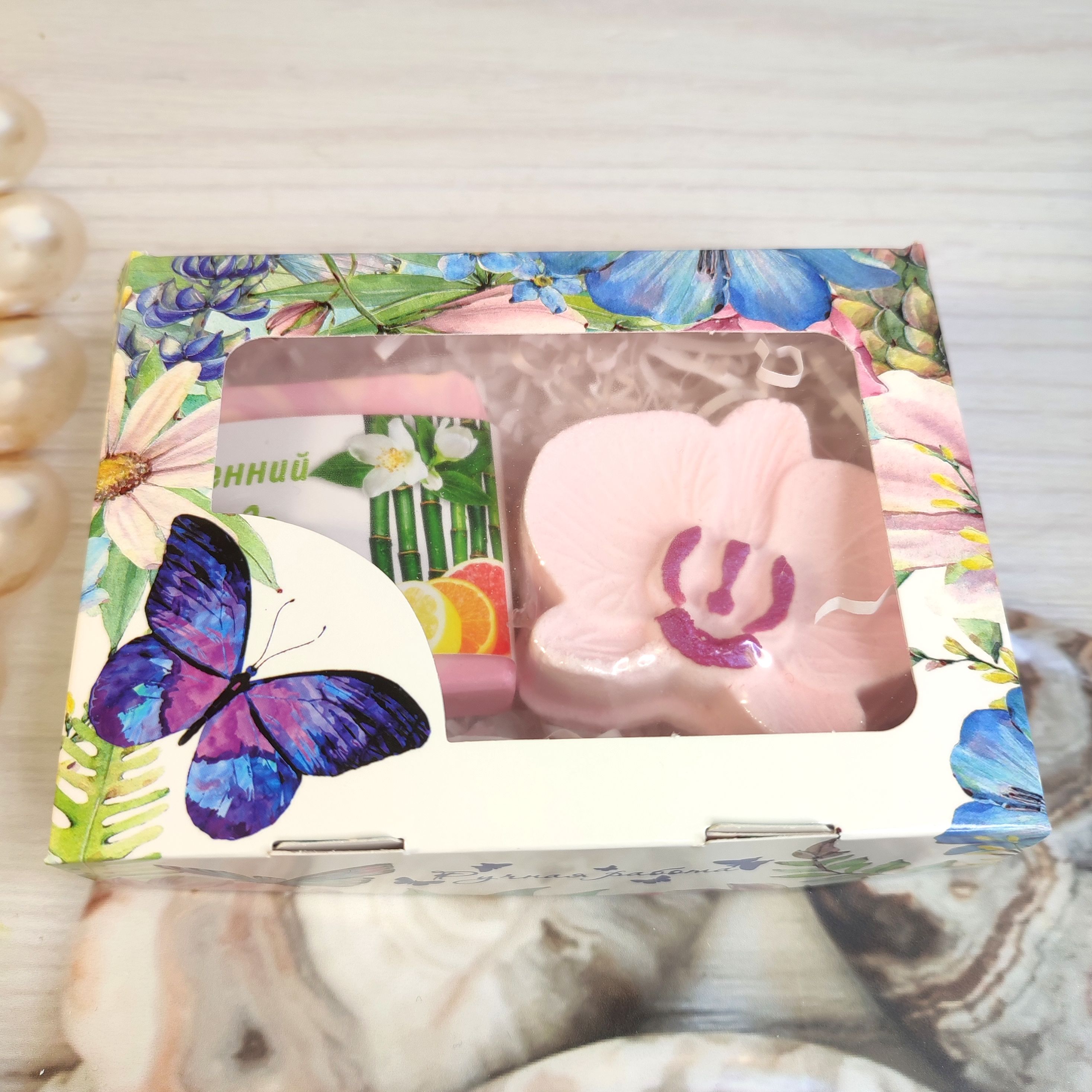 Подарочный наборчик, состоящий из бомбочки для ванны в форме орхидеи и кусочка ароматного натурального мыла (можно выбрать любое из наличия).
