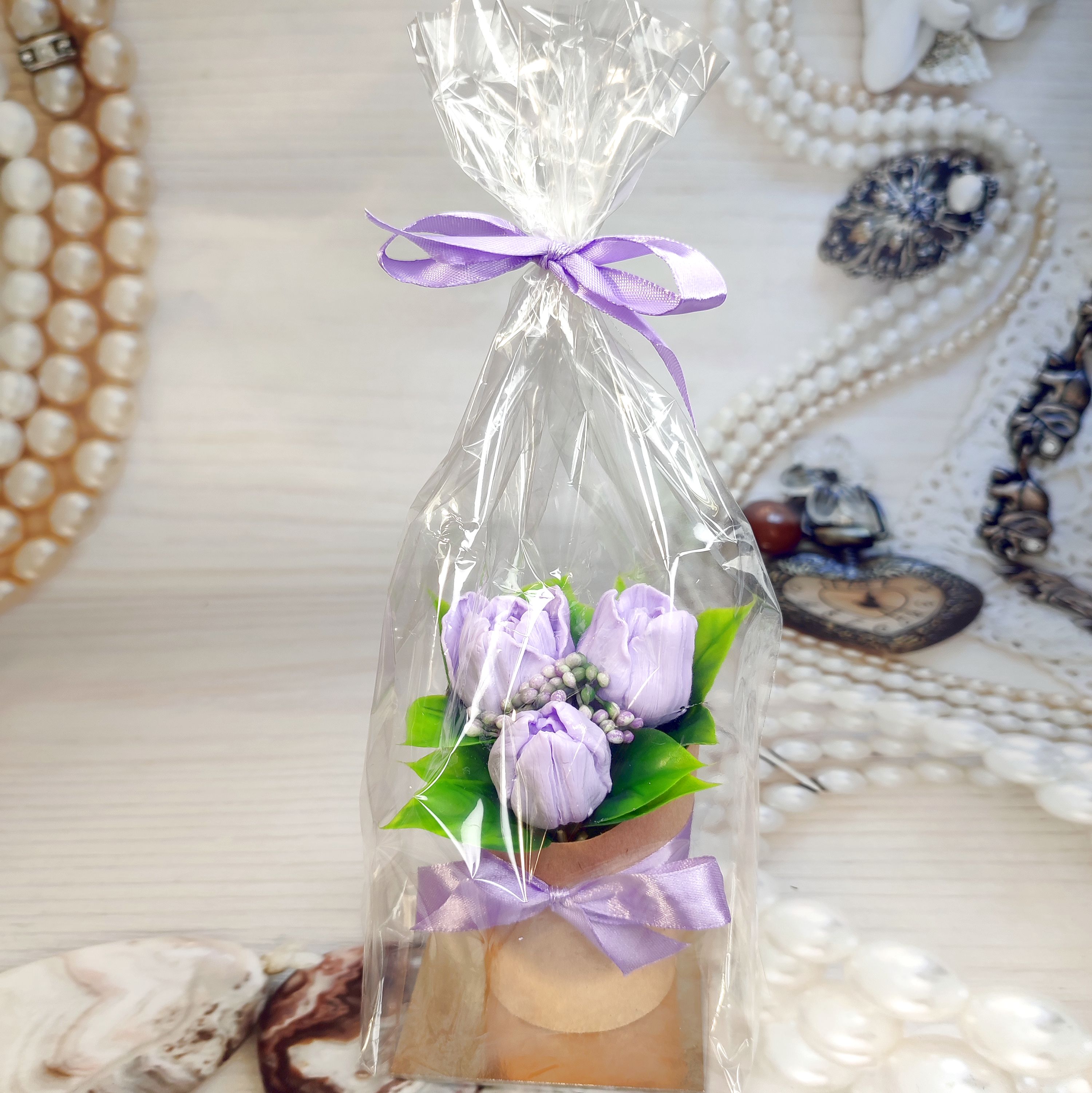Упакованы в пакет с жестким дном + лента с бантиком.