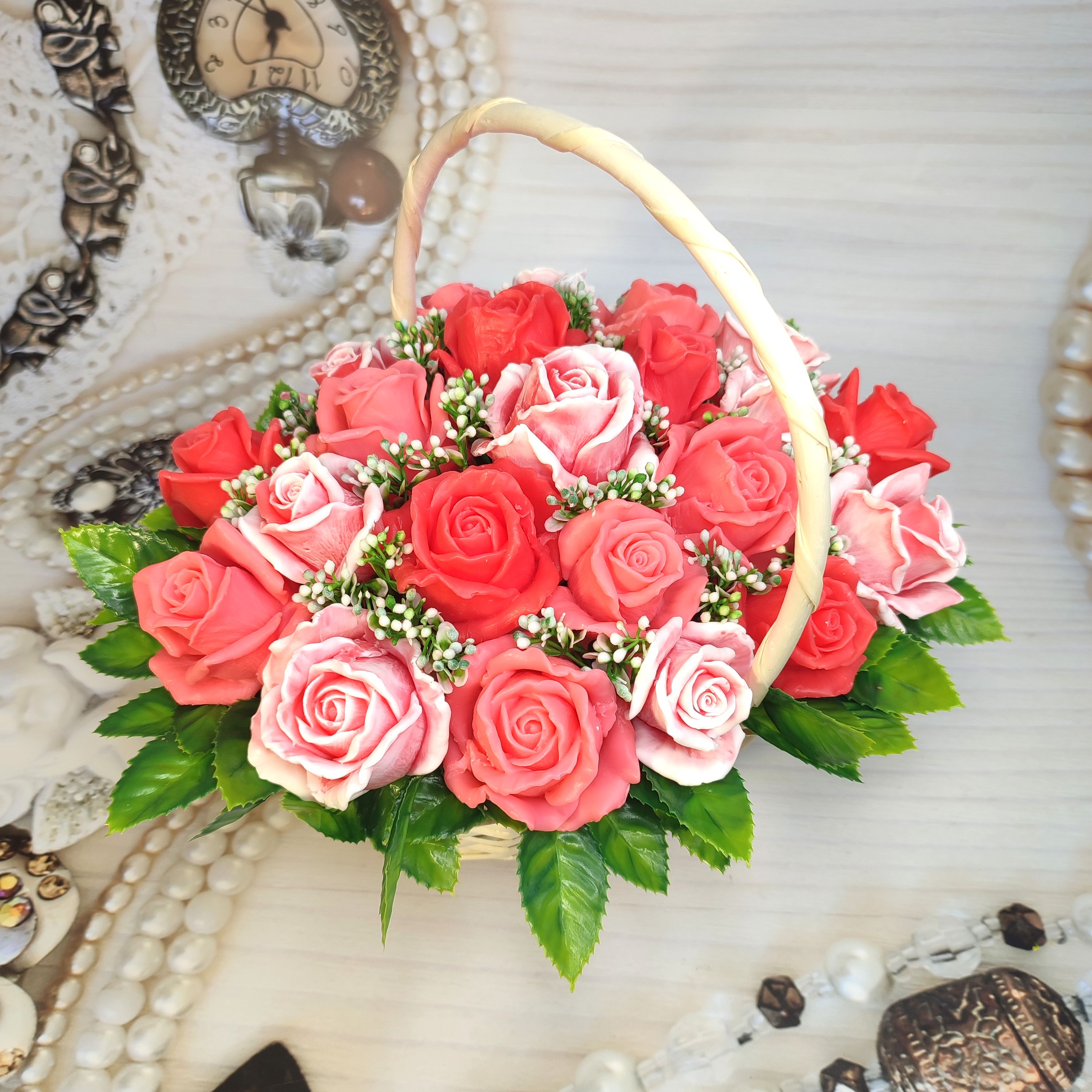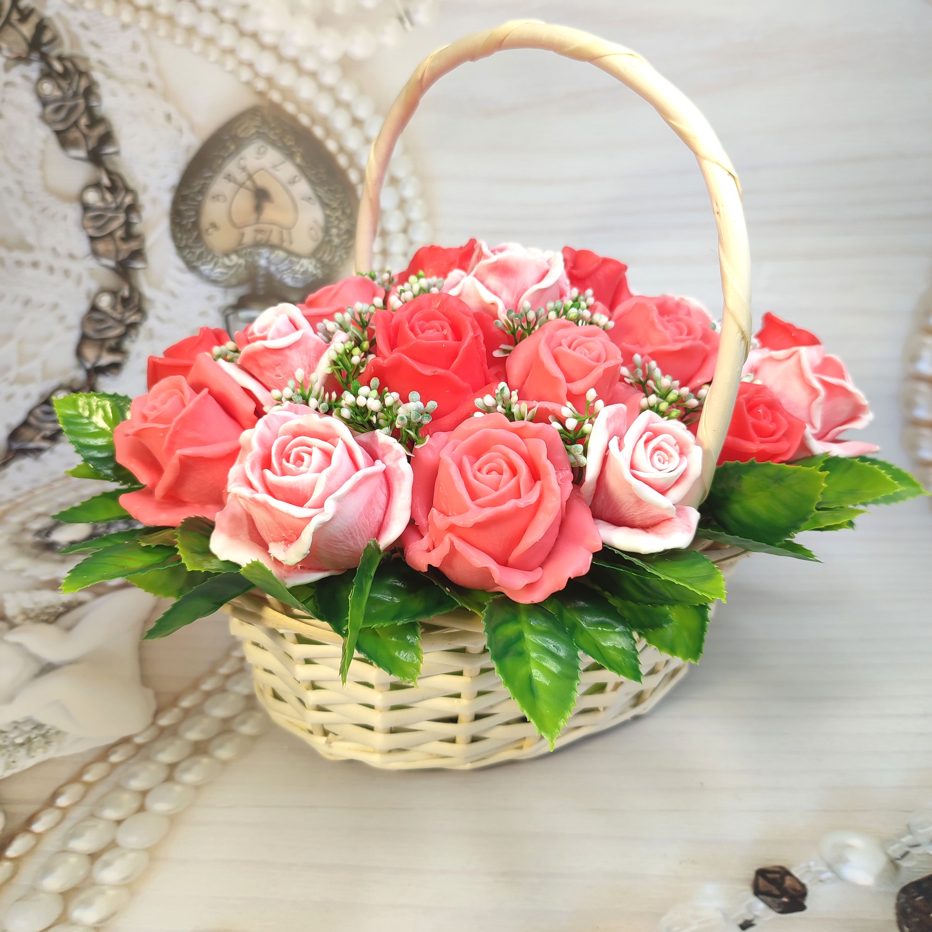 Композиция из 21 мыльной розы в большой корзине - запоминающийся подарок на юбилей или свадьбу.