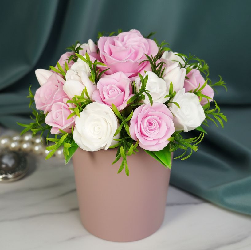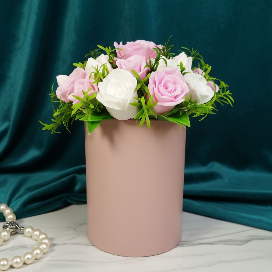 Собранный из нежных розовых и белоснежных роз в высокой шляпной коробке, он символизирует чистую красоту и возвышенные эмоции. Каждый цветок — это шаг к вершине, а весь букет — триумф вашей любви и признательности.