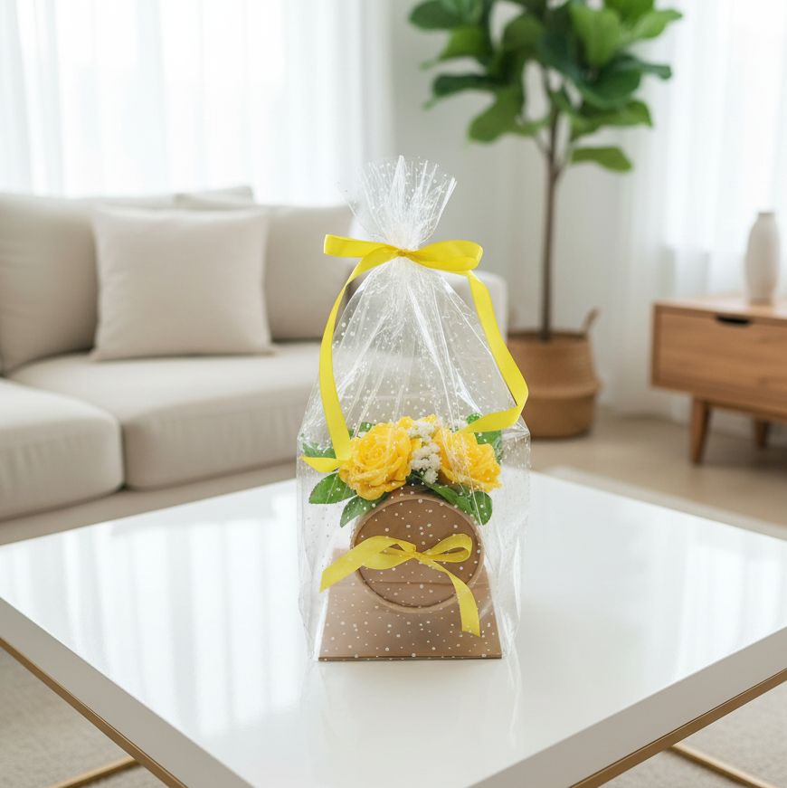 Маленький букетик ярких жёлтых роз в крафтовом стаканчике.