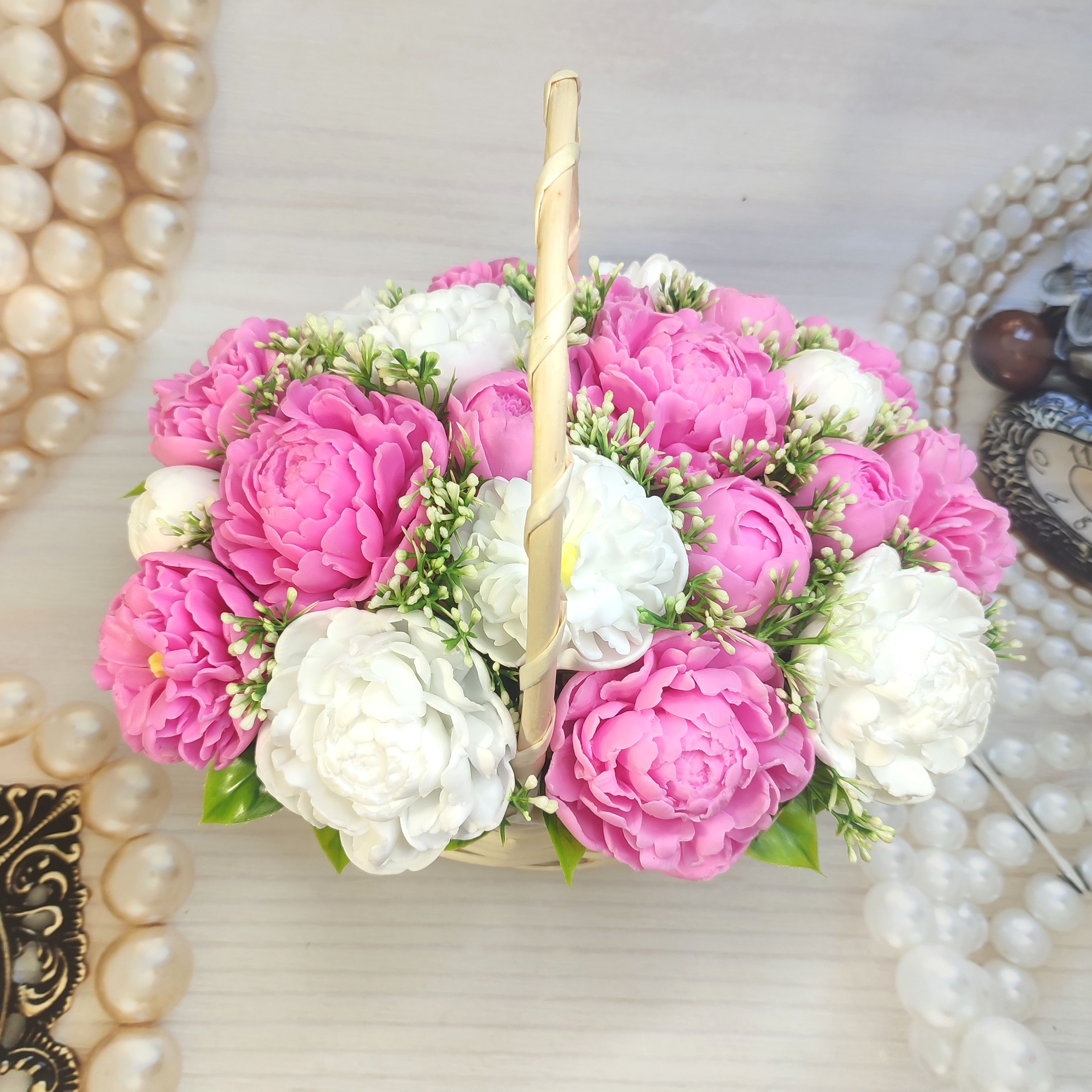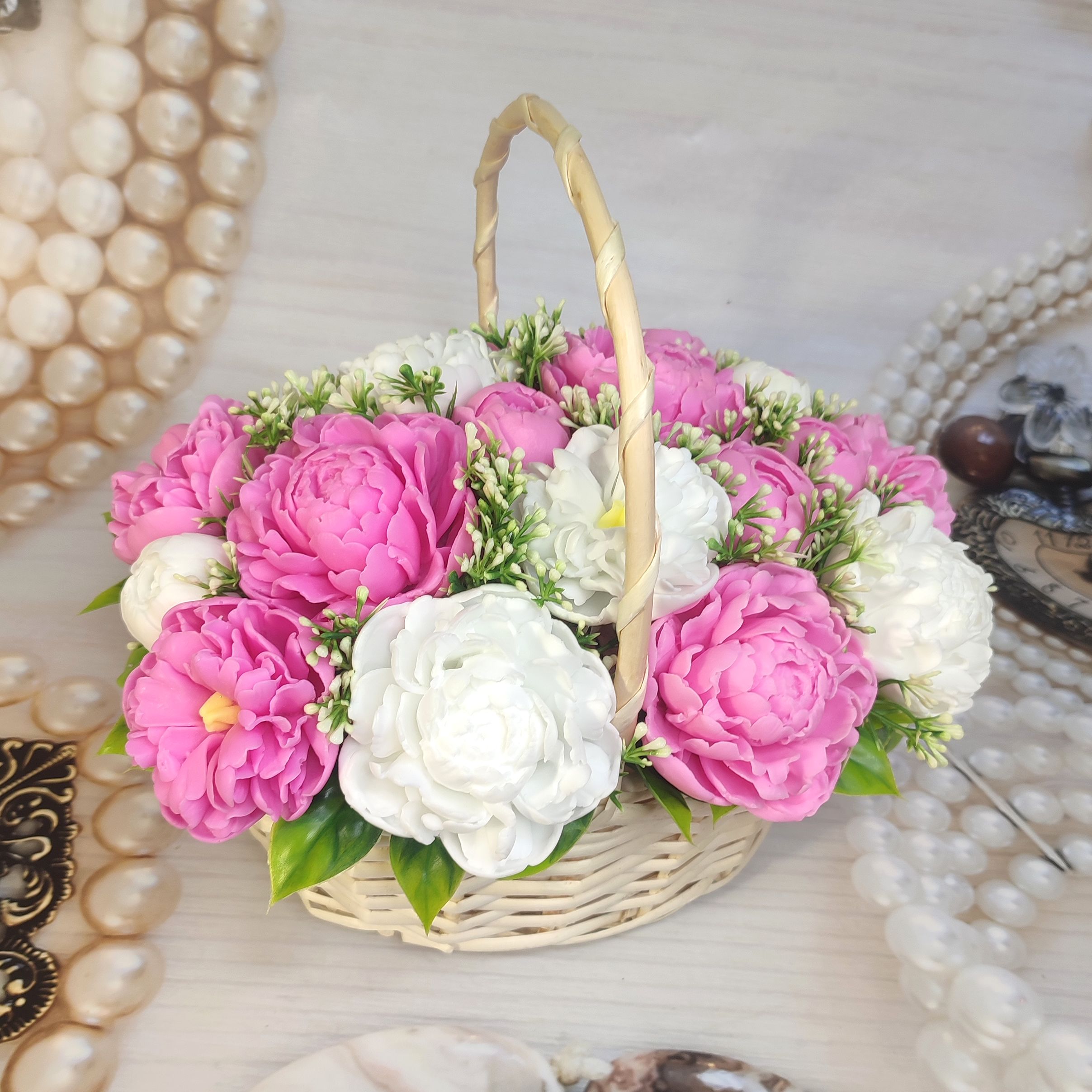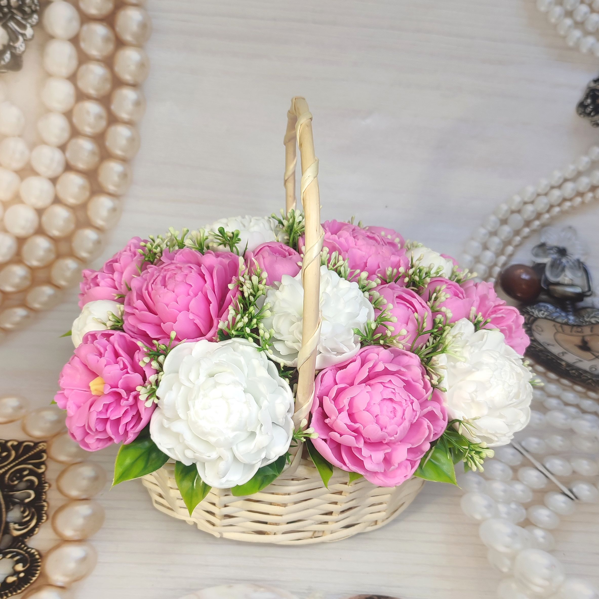Роскошная корзина c пышными пионами в нежно-розовых и белоснежных оттенках. Каждый цветок демонстрирует свою уникальную красоту и изящество.