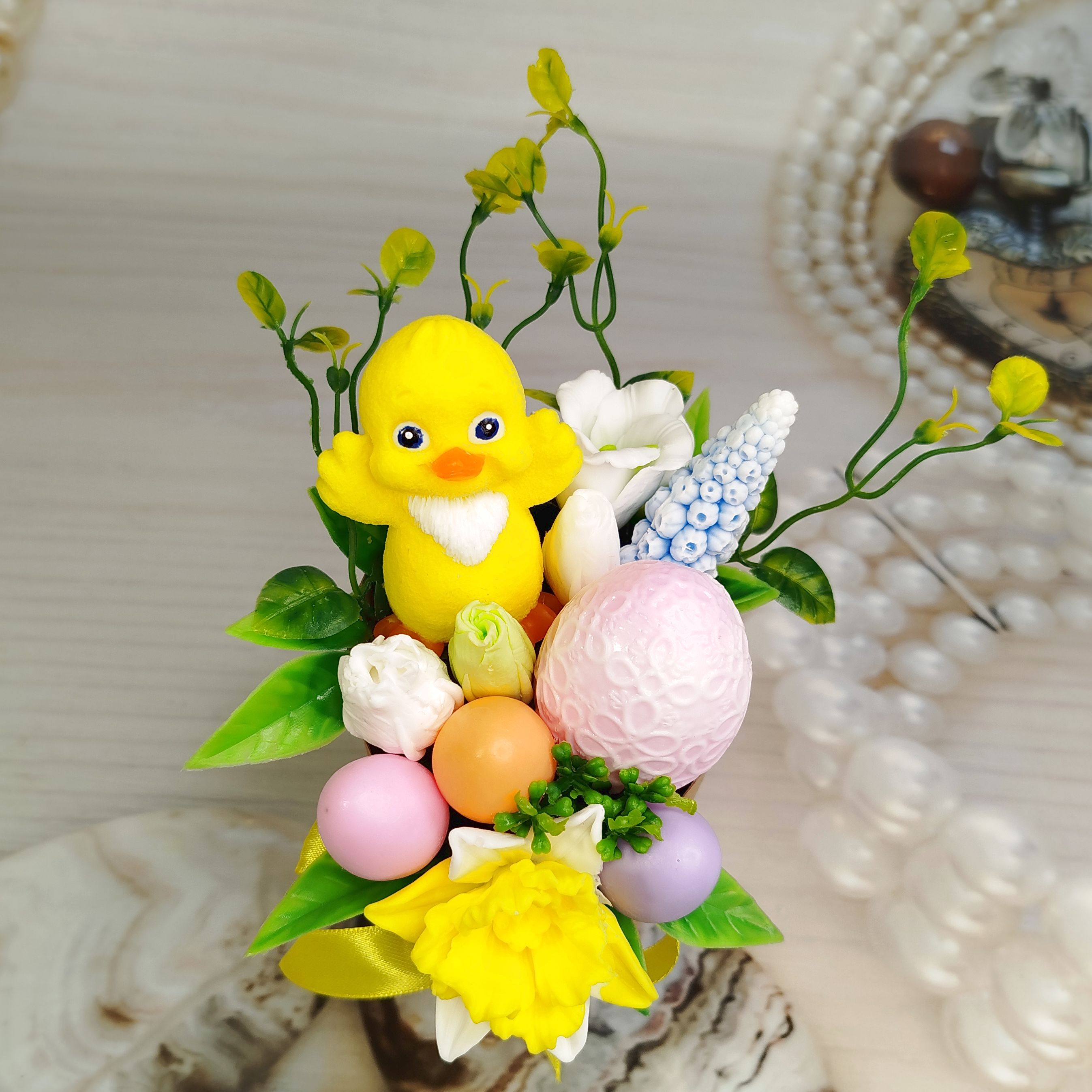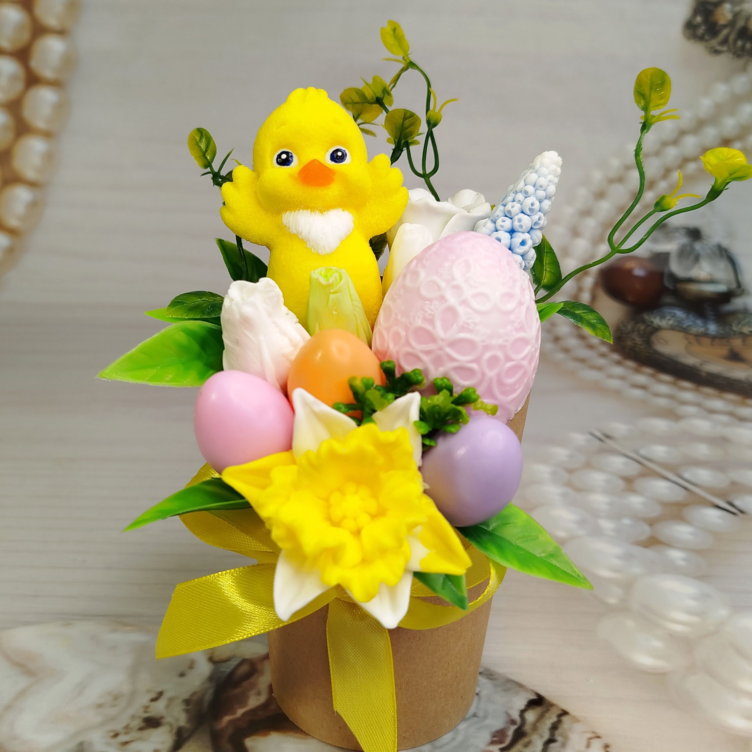 Встречайте светлую Пасху с весенним букетом! Этот милый цыплёнок из мыла, окруженный яркими и ароматными цветами, словно кусочек весеннего сада, принесет в ваш дом радость и солнечное настроение. Подарите близким символ тепла и обновления! Почувствуйте радость Пасхи!