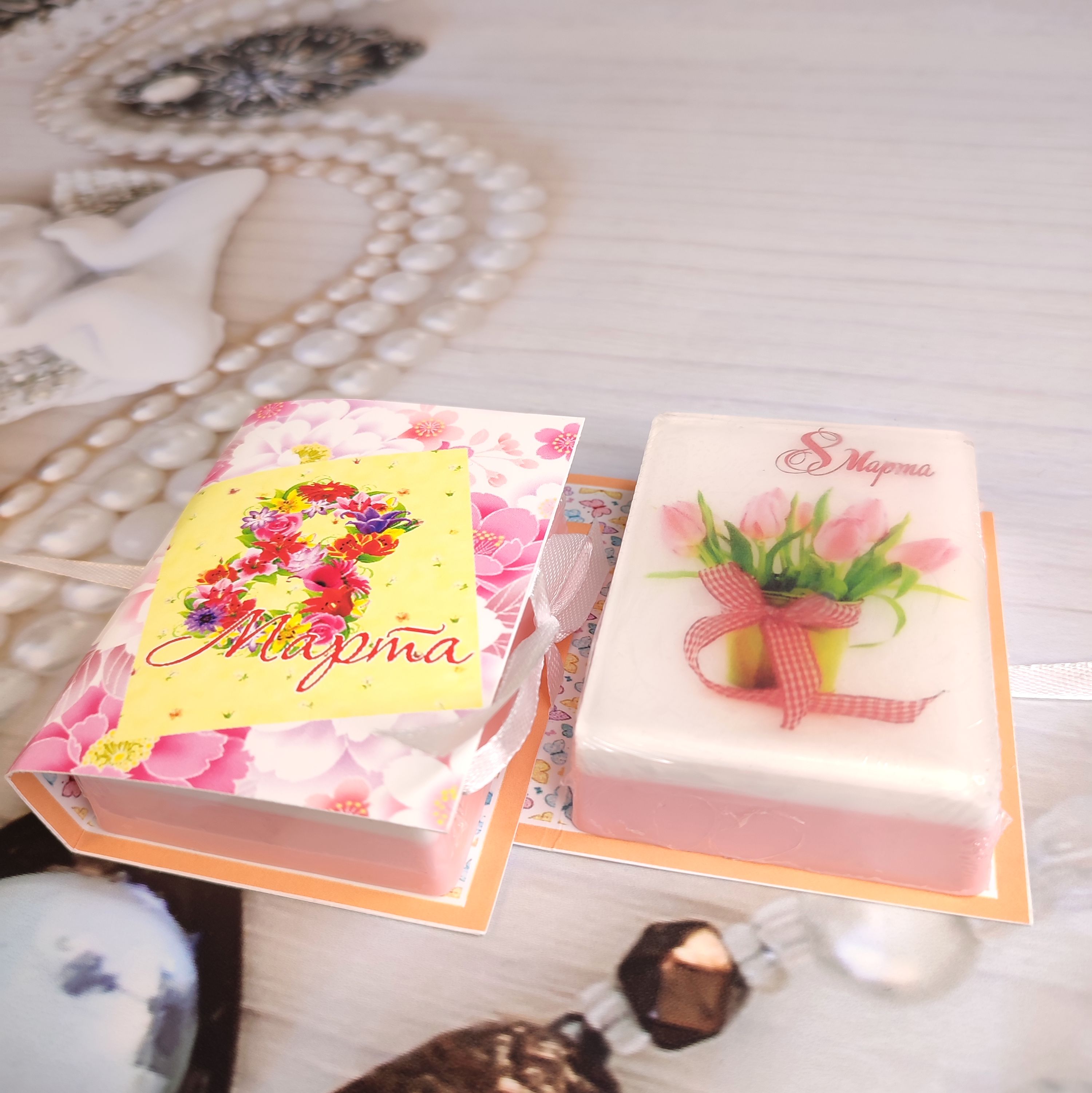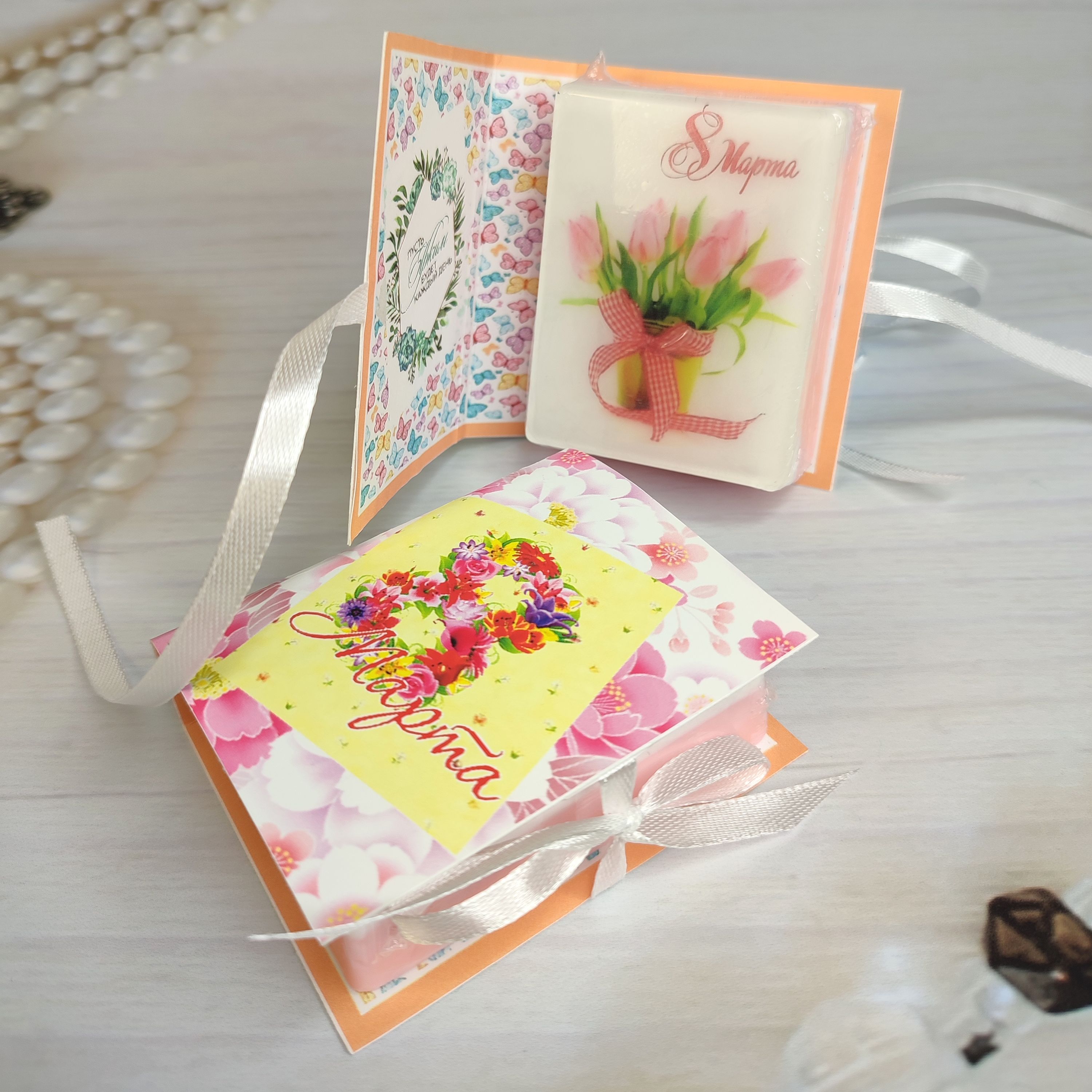 Мыло с принтом, оригинально оформленное в виде открытки.