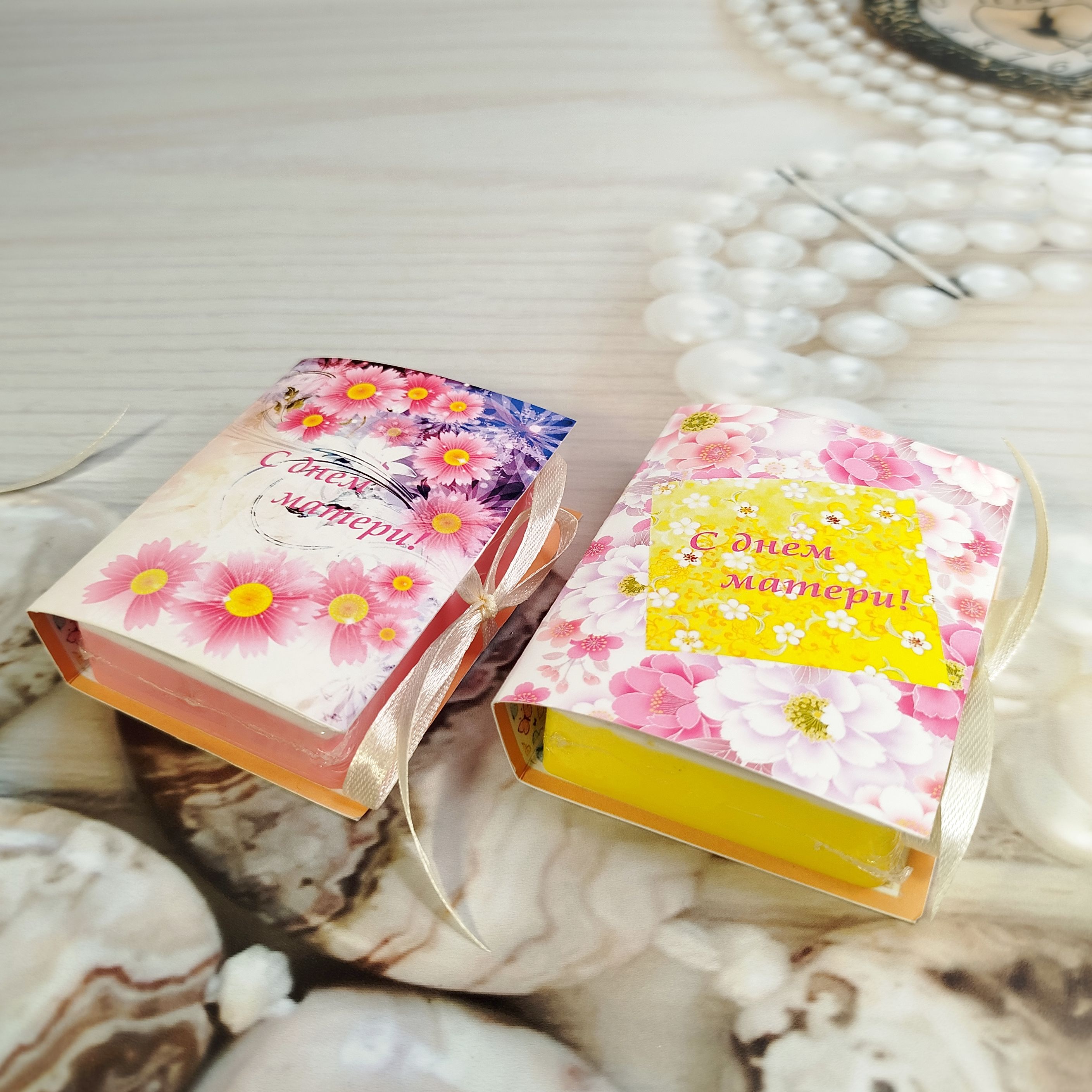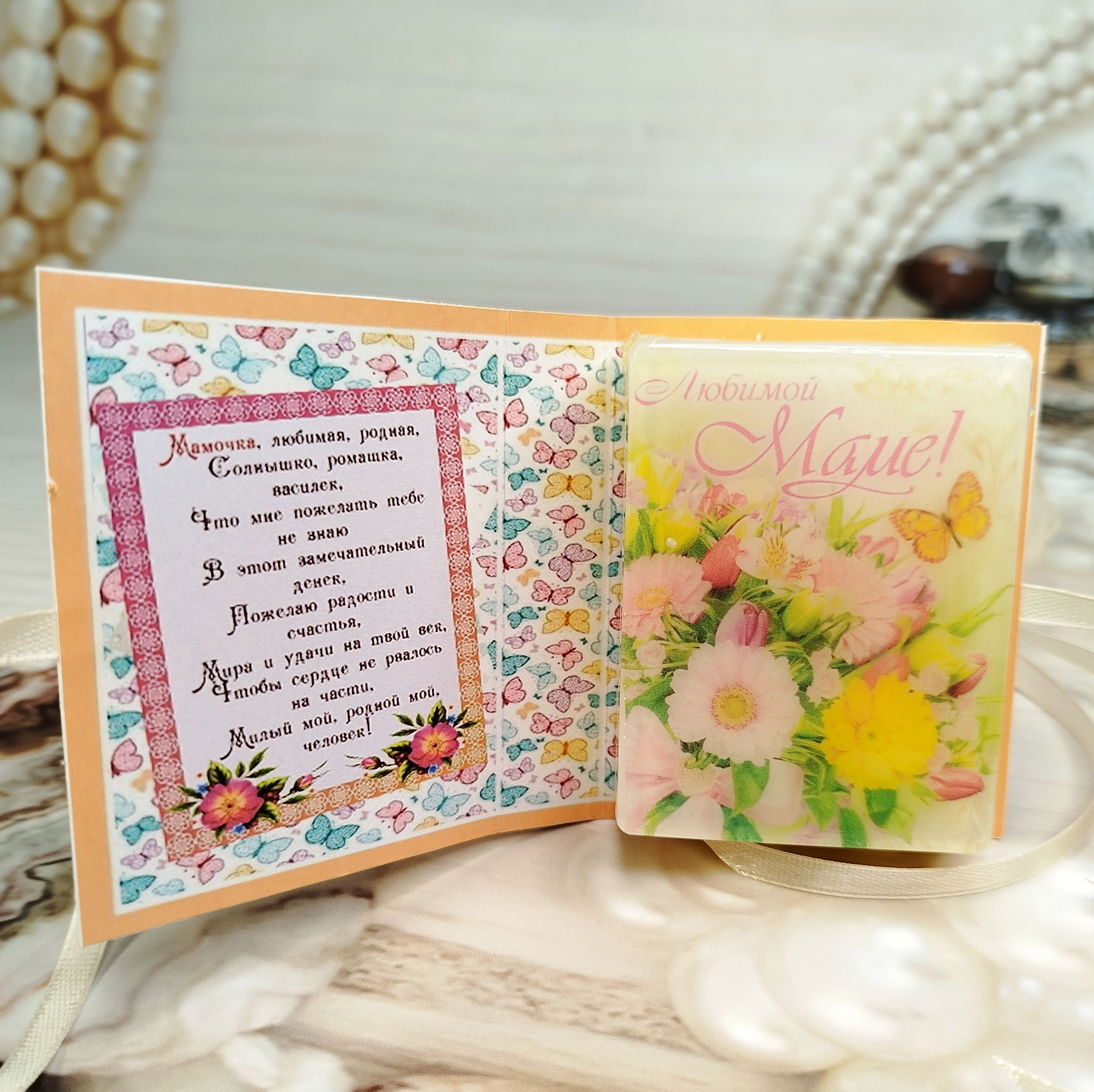 Мыло с поздравлением, оригинально оформленное в виде открытки.