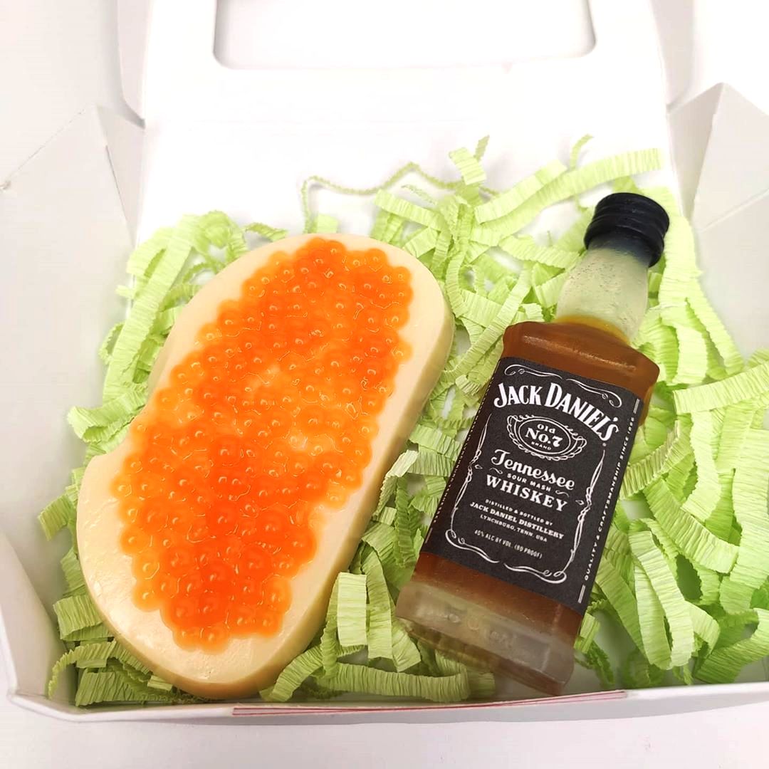 Мыльный Jack Daniels и аппетитный бутерброд с красной икрой.