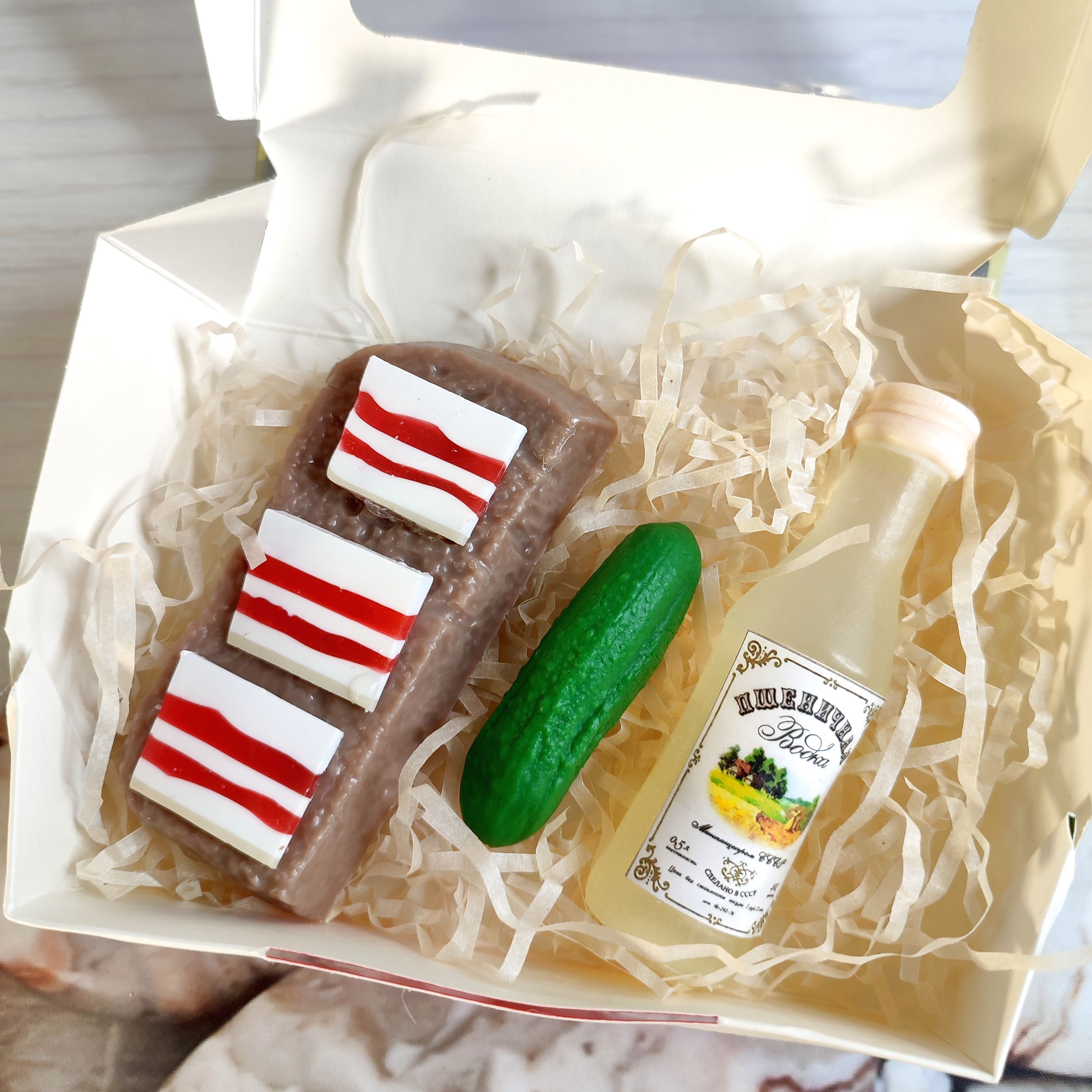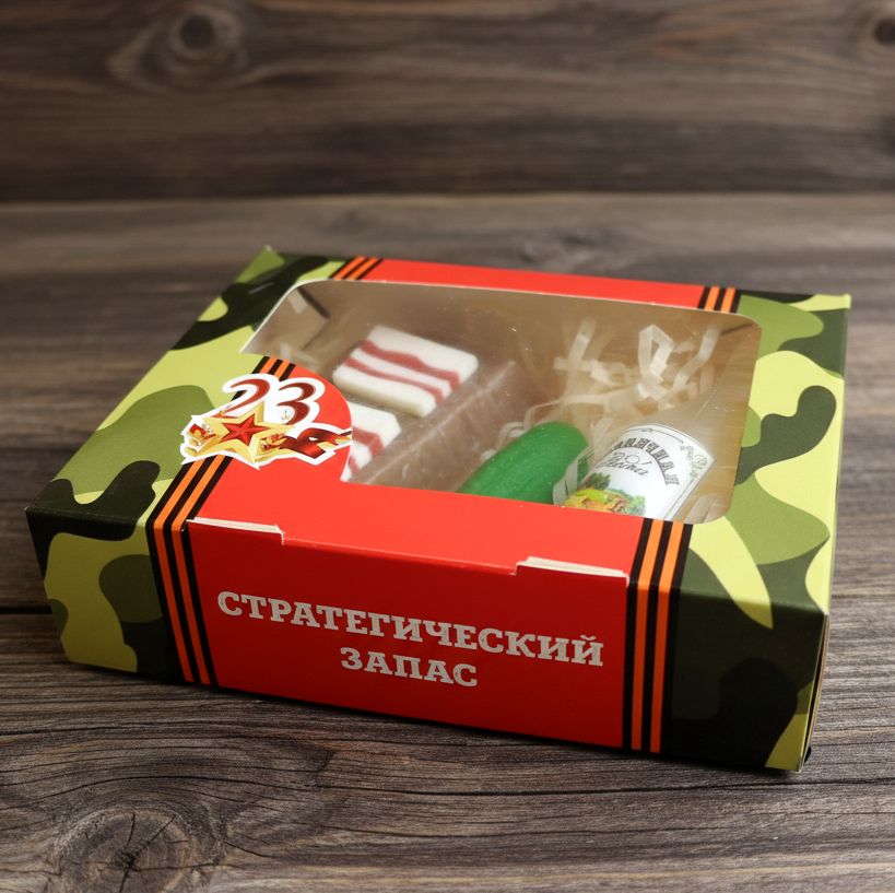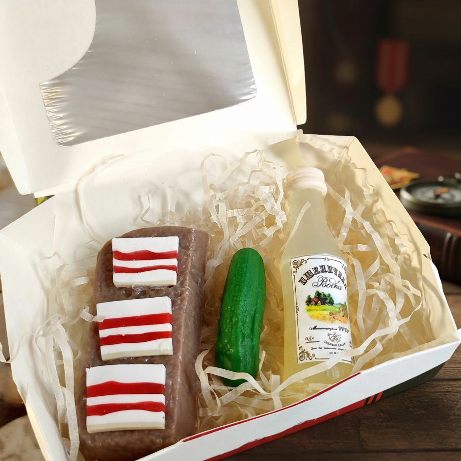 Коробочка может быть не обязательно к 23 Февраля.Такой наборчик уместен в любое время года и конечно же всё это (включая хлебушек) изготовлено из мыла.Ручная работа.