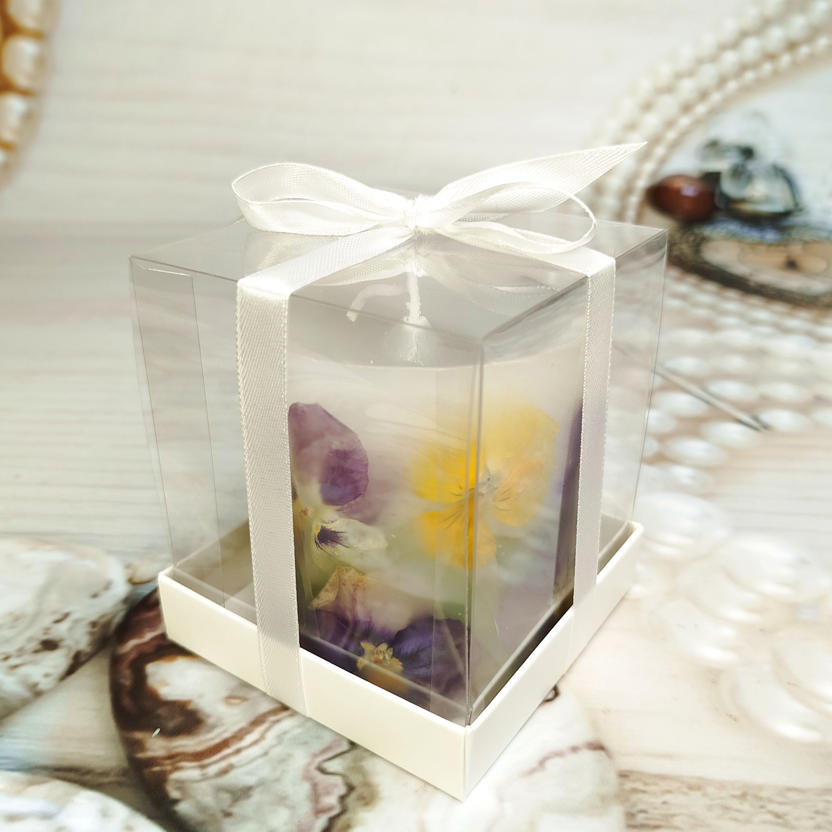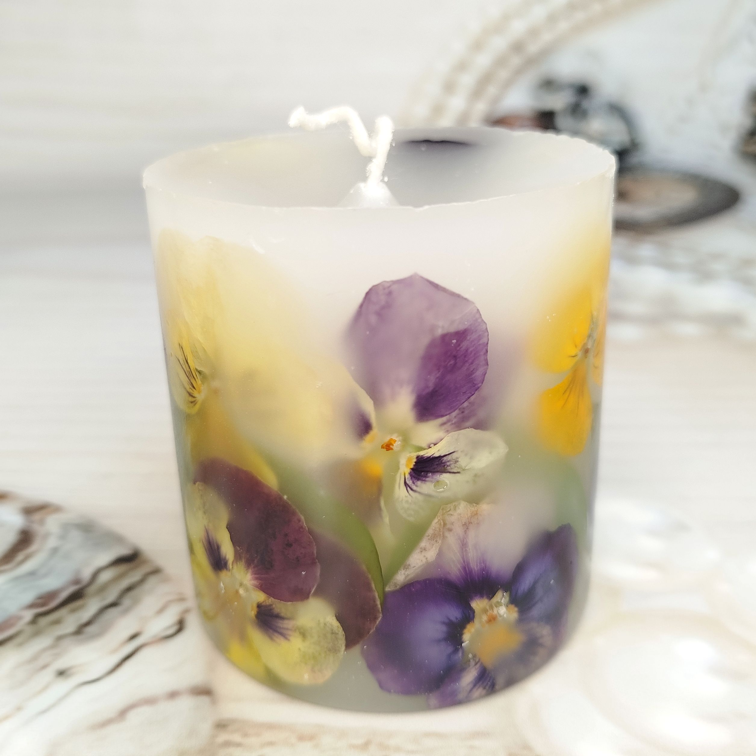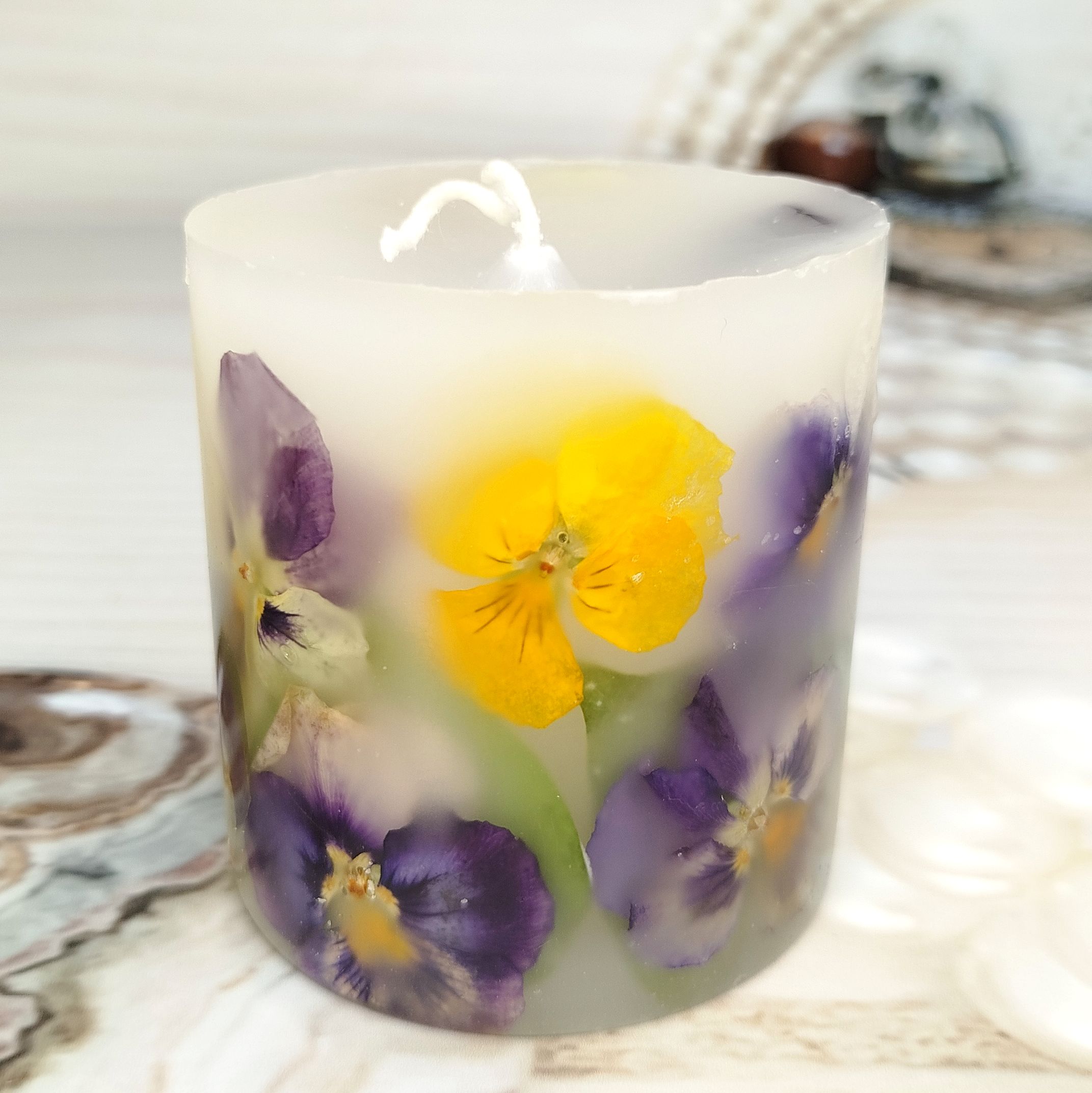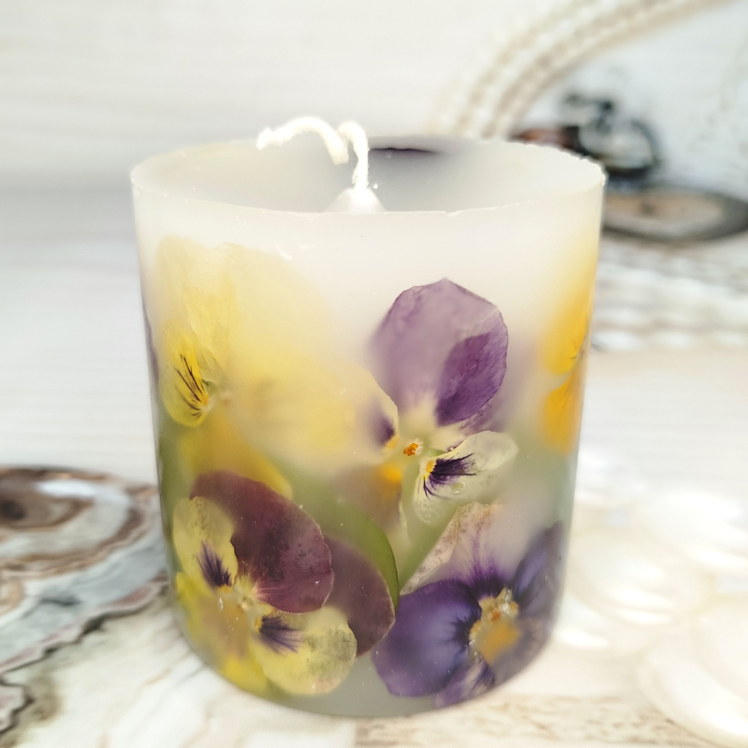 Каждая ботаническая свеча - это маленькое произведение искусства, созданное с любовью. Внутри - настоящие, бережно сохраненные цветы анютиных глазок, которые привнесут в ваш дом весеннее настроение и легкость. Зажгите её, чтобы ощутить тепло и увидеть, как свет оживляет эти прекрасные лепестки.