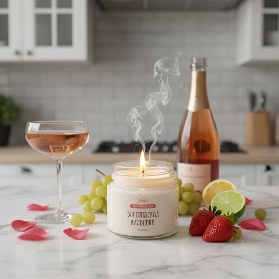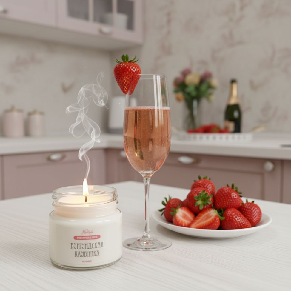 Клубника и Шампанское – ваш идеальный дуэт для праздника души! Ароматическая свеча "БУРГУНДСКАЯ КЛУБНИКА" из натурального 100% соевого воска.