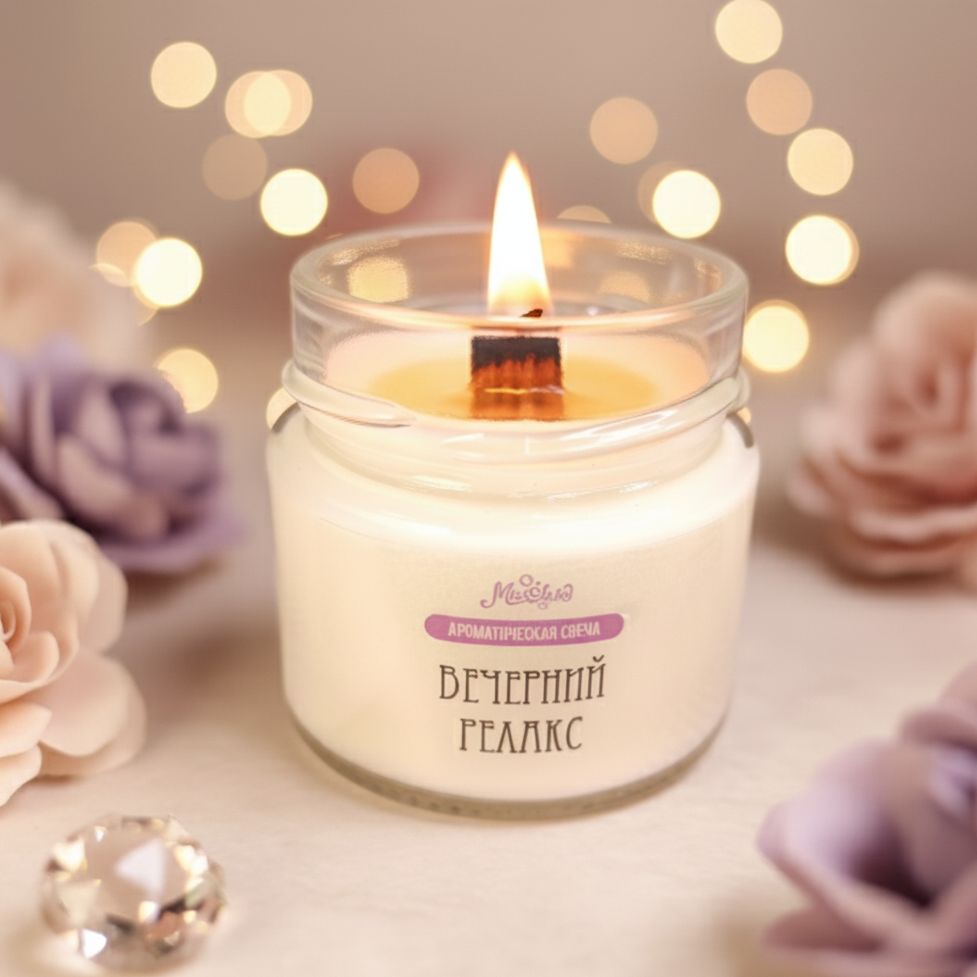 Откройте для себя магию "Вечернего релакса"! Успокаивающий и сбалансированный аромат этой свечи - это идеальное завершение долгого дня. Насладитесь гармоничным сочетанием свежего лемонграсса и сочной черной смородины, которые плавно переходят в теплые оттенки пачули и сладкого сахарного тростника. Забудьте о суете и проблемах. Это великолепный круглогодичный аромат, который хорошо вписывается в линию ароматерапии. А как приятно потрескивает при горении деревянный фитиль... Ручная работа. Натуральные ингредиенты.