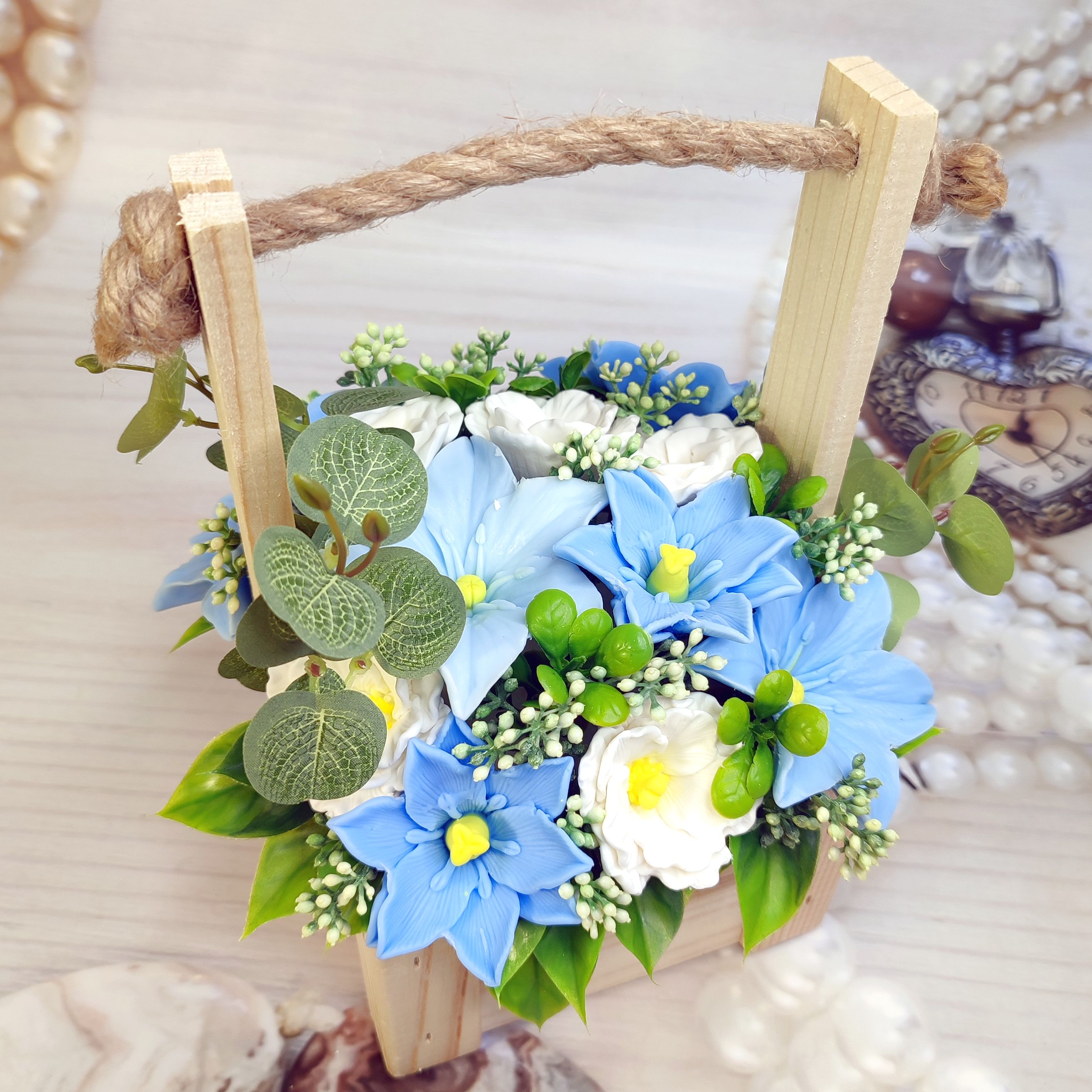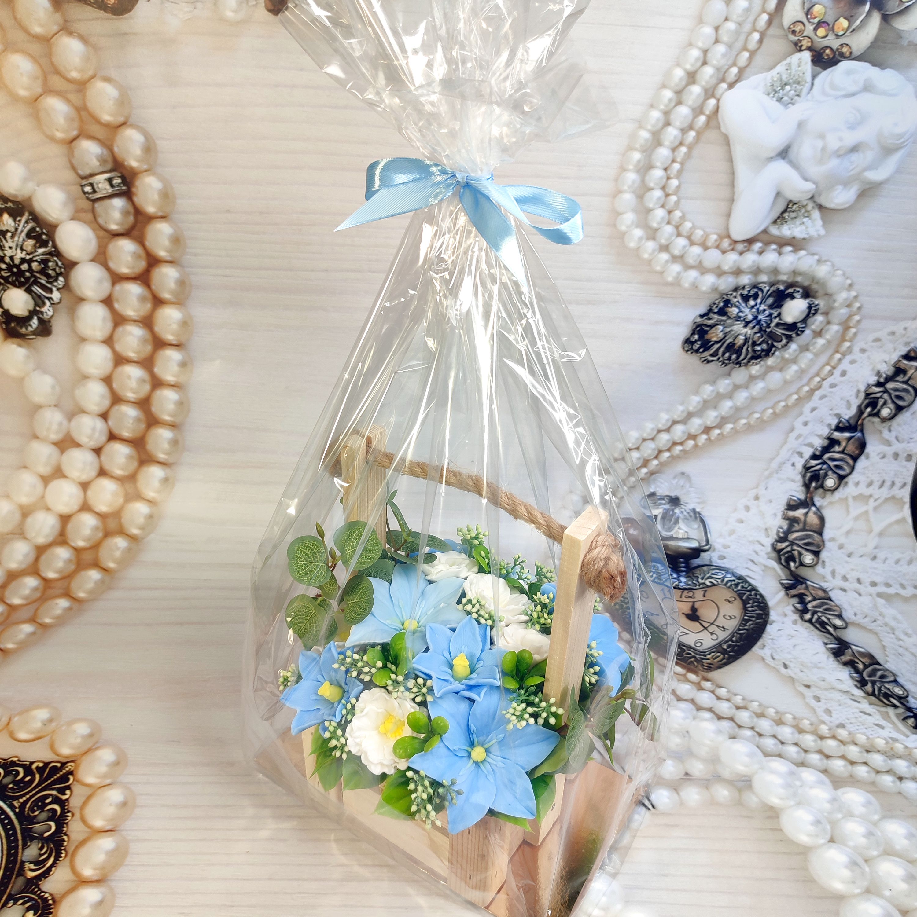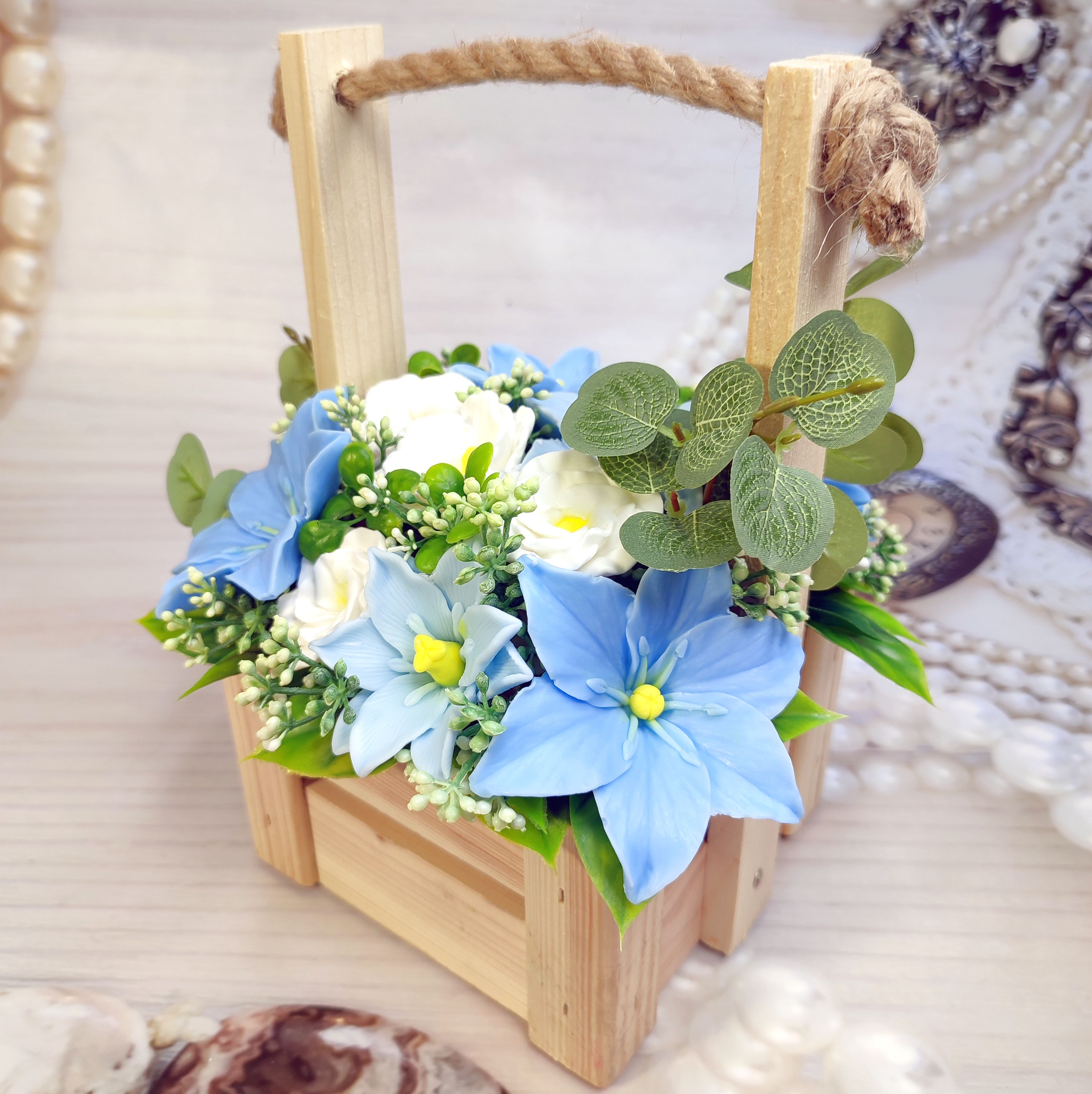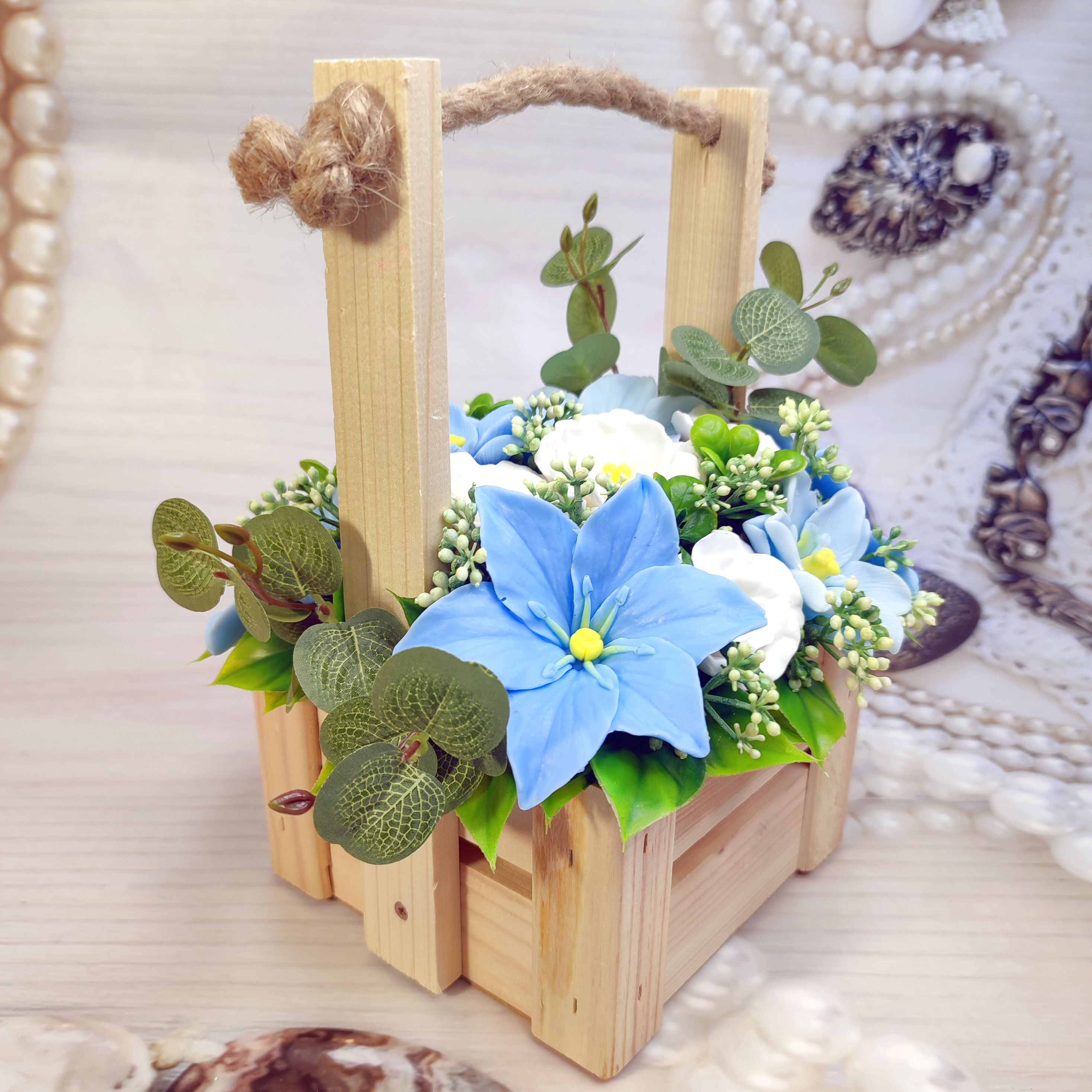 Когда мне сделали этот заказ, я не была уверена в конечном результате. Была поставлена задача сделать букетик в ящике, цветы должны быть лилии и преимущественно голубого цвета + как компаньон белые цветы, но только не розы...