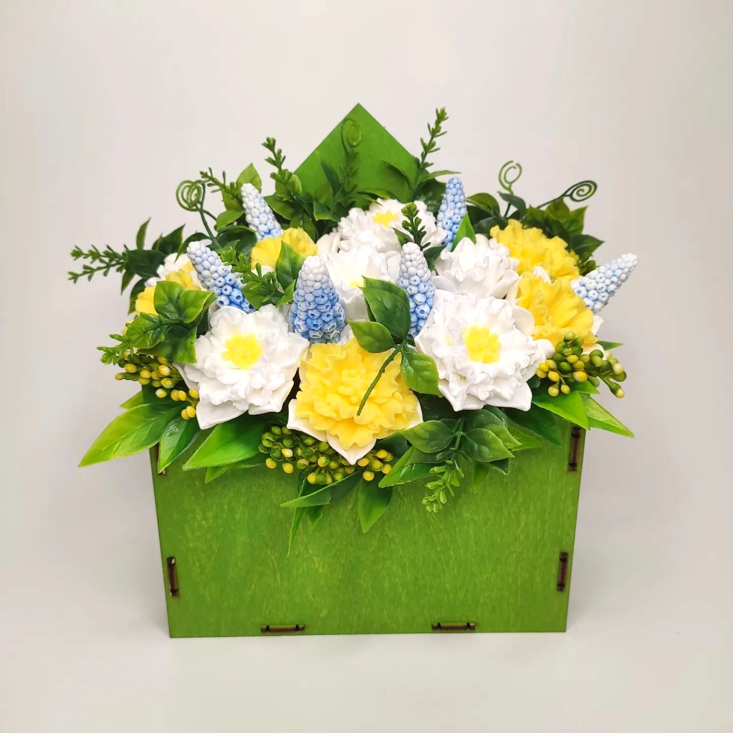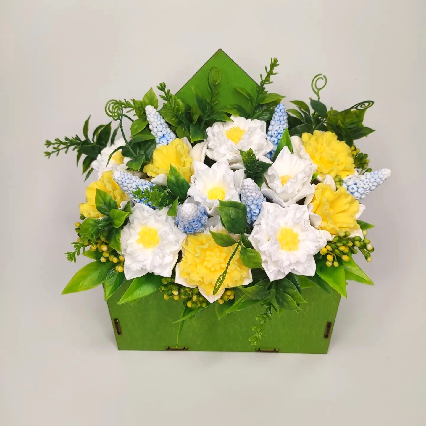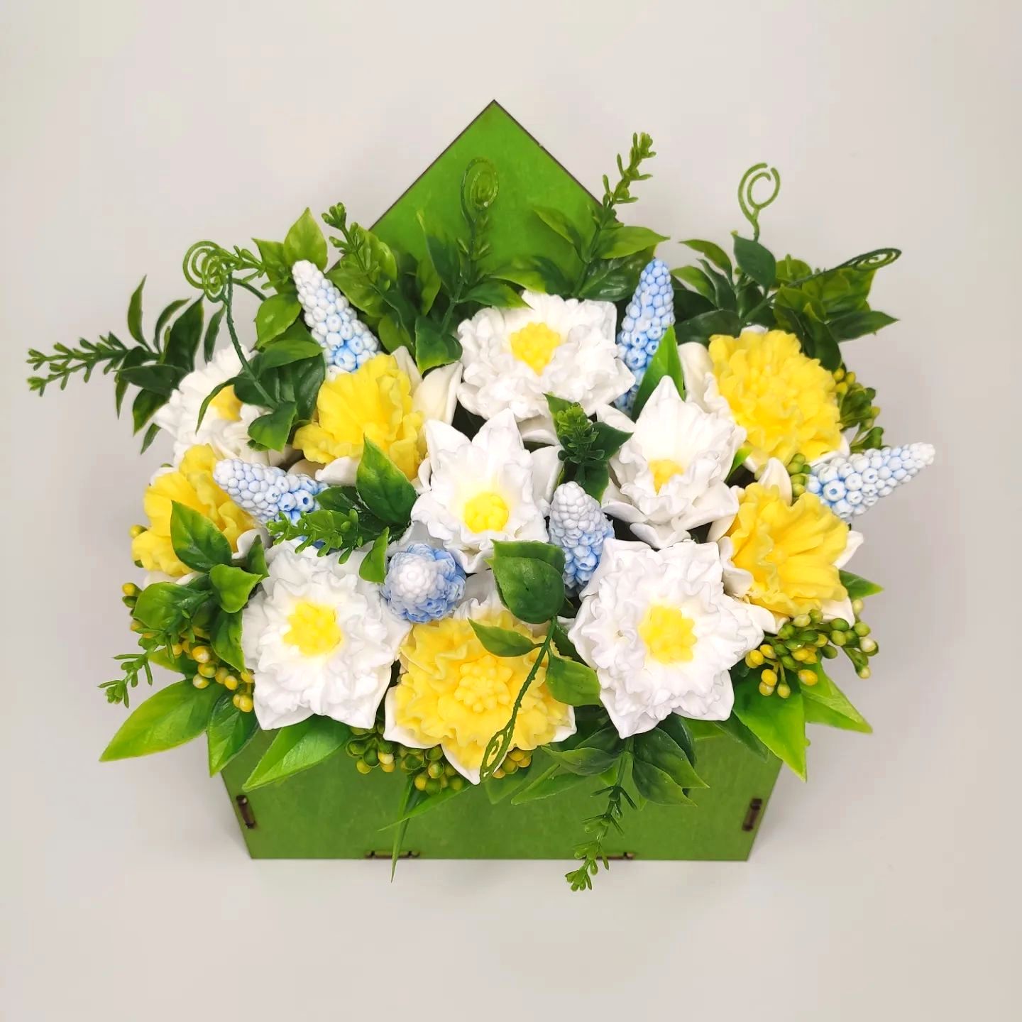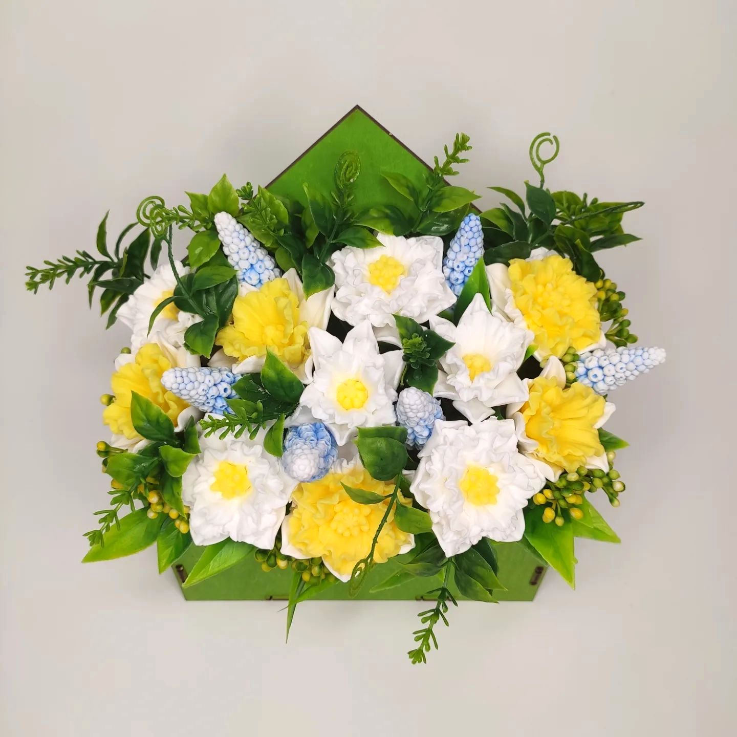 Нарциссы и мускари в деревянном конверте.