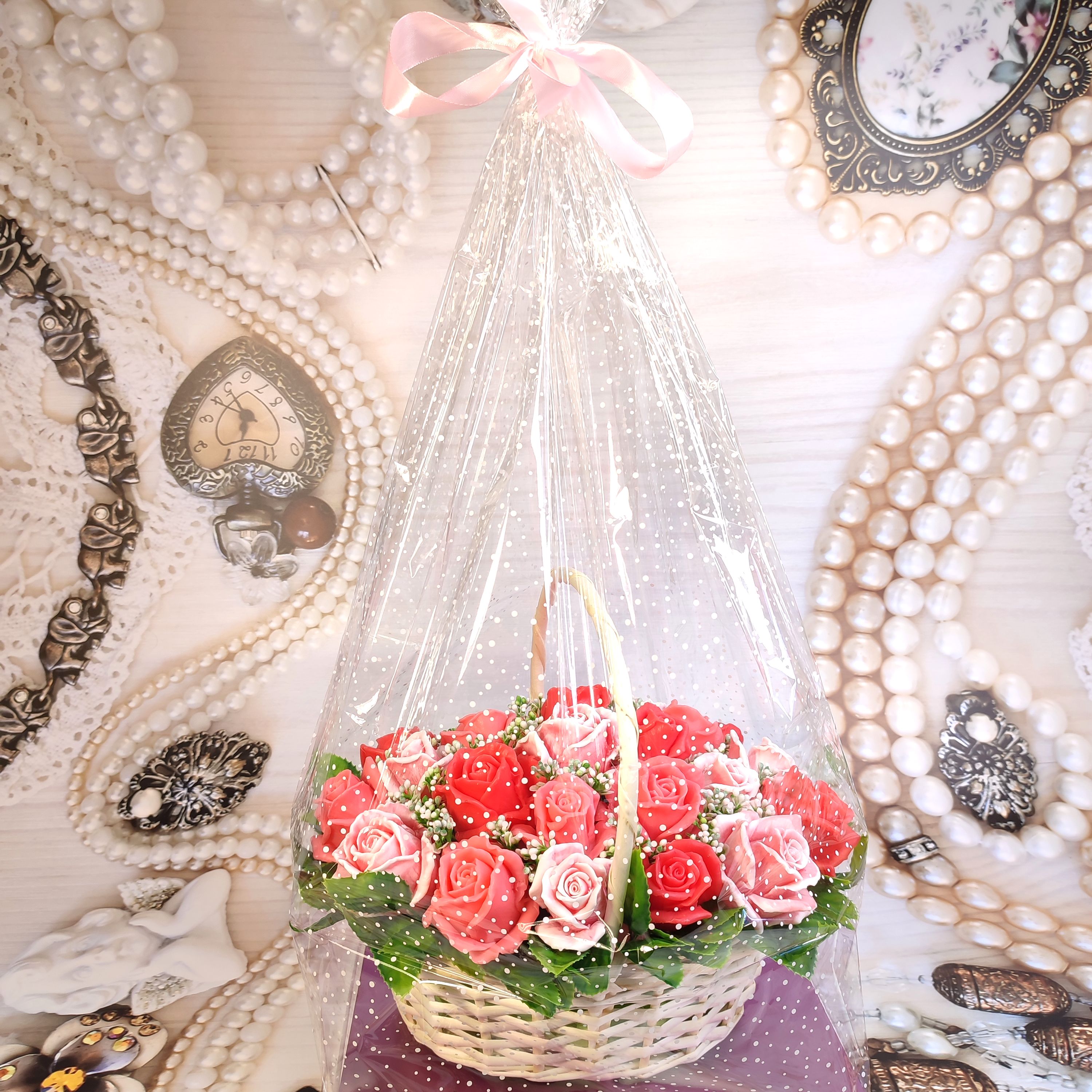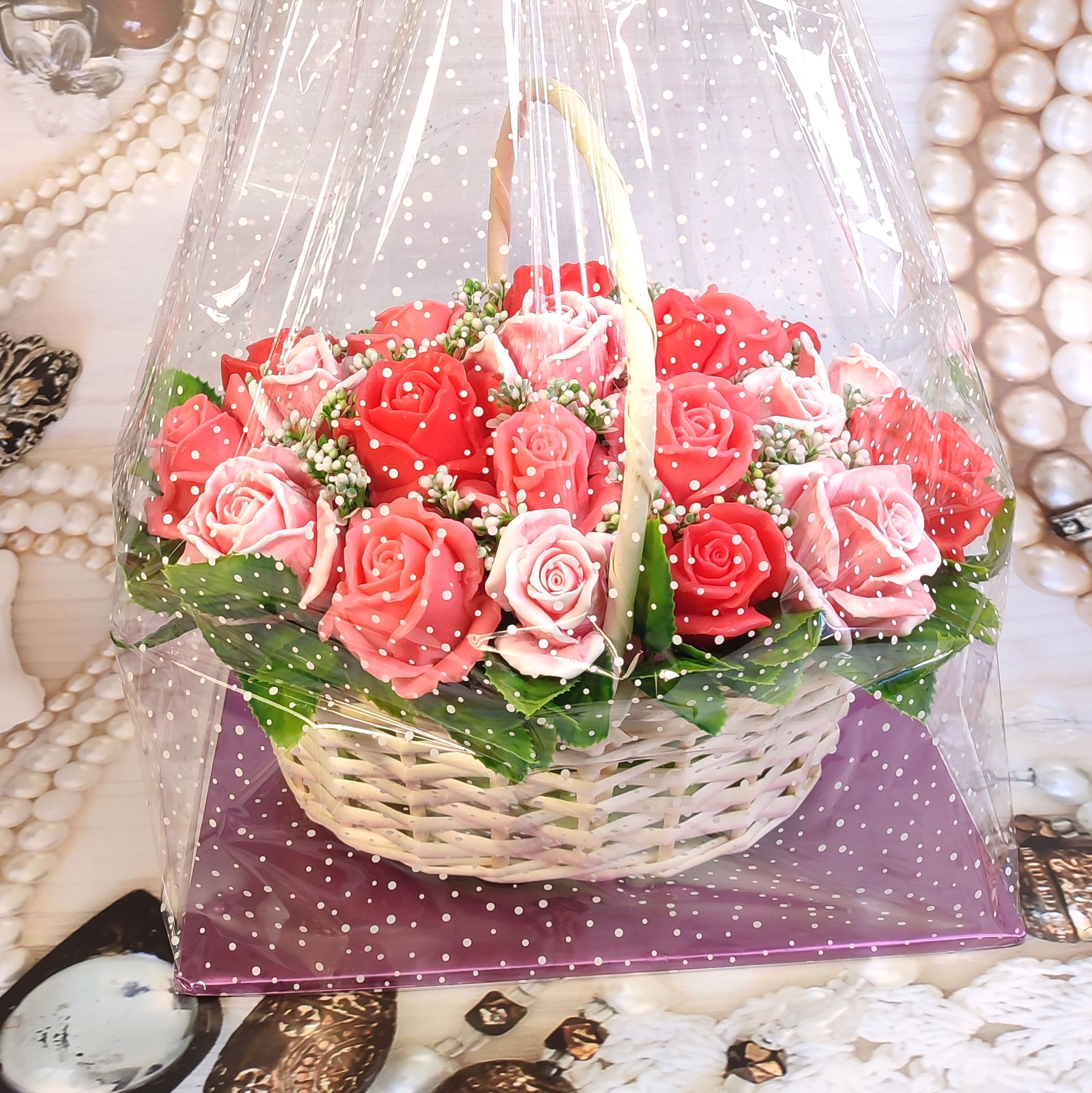 Композиция из 21 мыльной розы в большой корзине - запоминающийся подарок на юбилей или свадьбу.