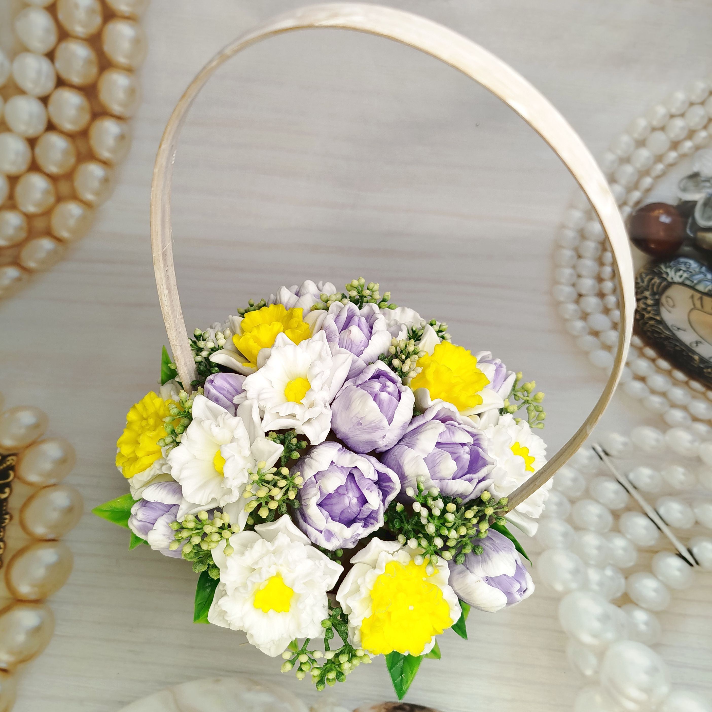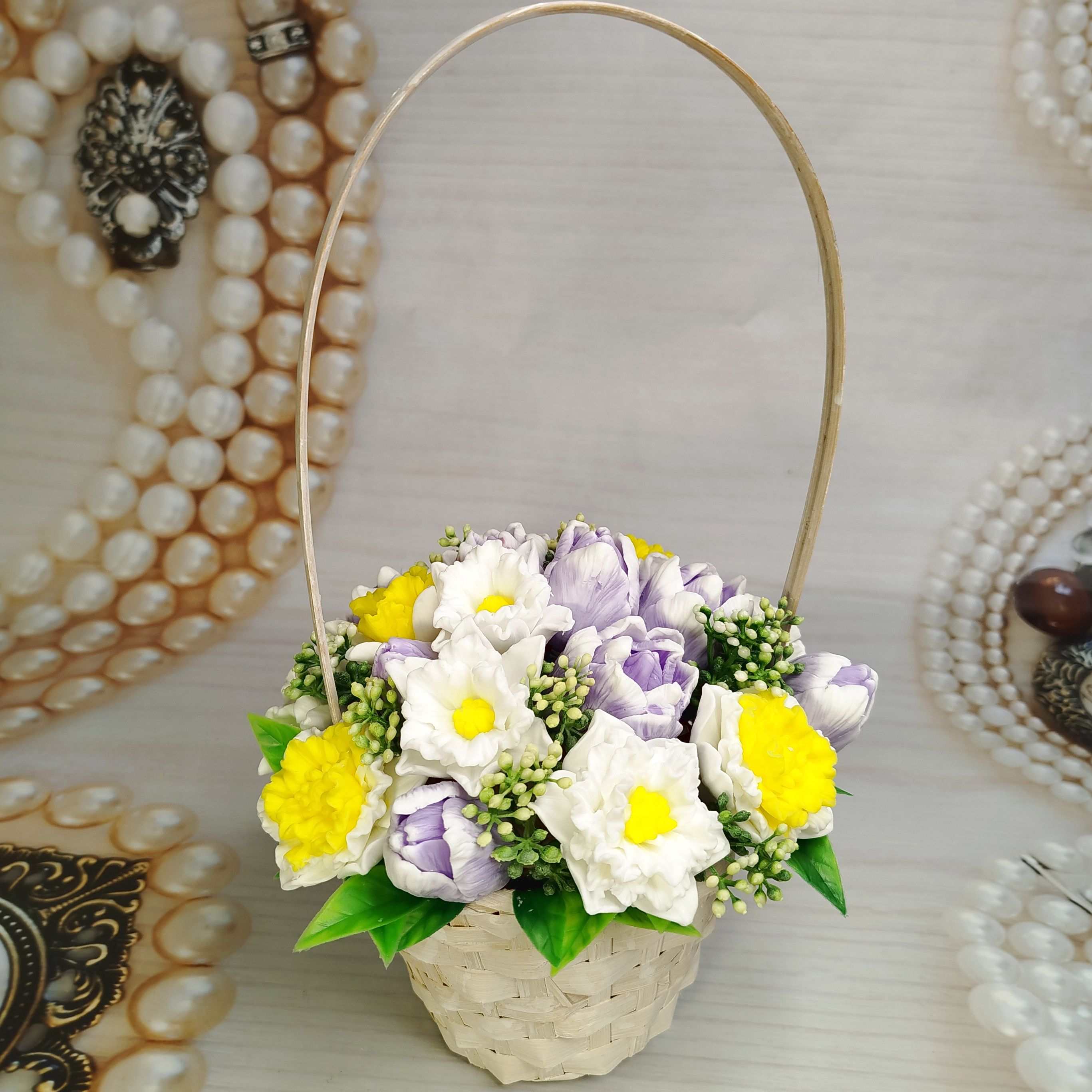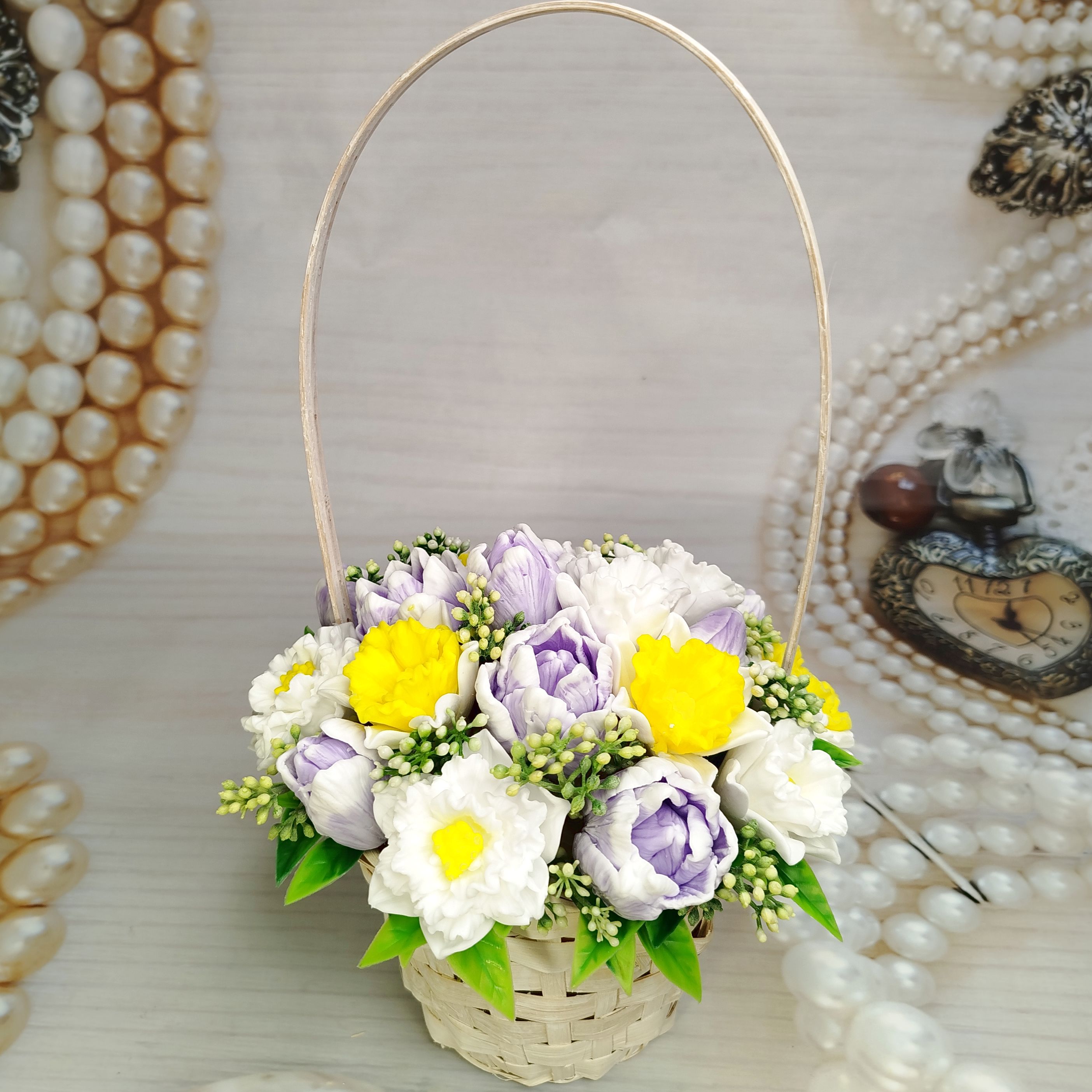 Нарциссы и тюльпаны - одни из самых первых весенних цветов, и в этой корзинке они дуэтом наполнят Ваш дом теплом и ароматом весны! Этот красивый и ароматный букет из мыла ручной работы – не только оригинальное украшение, но и практичный сувенир. Пусть ваши родные и друзья почувствуют приближение весны с этим уникальным подарком!