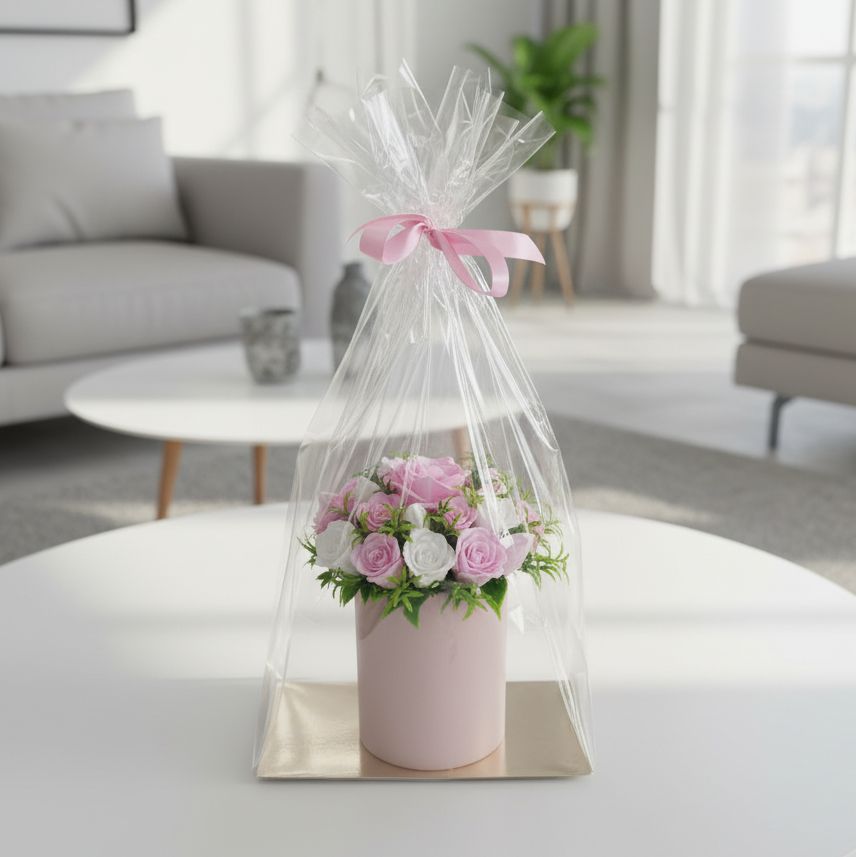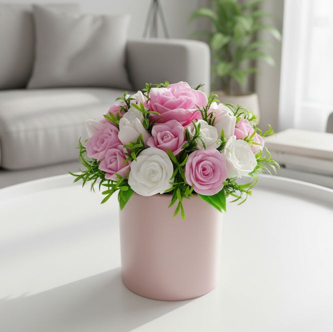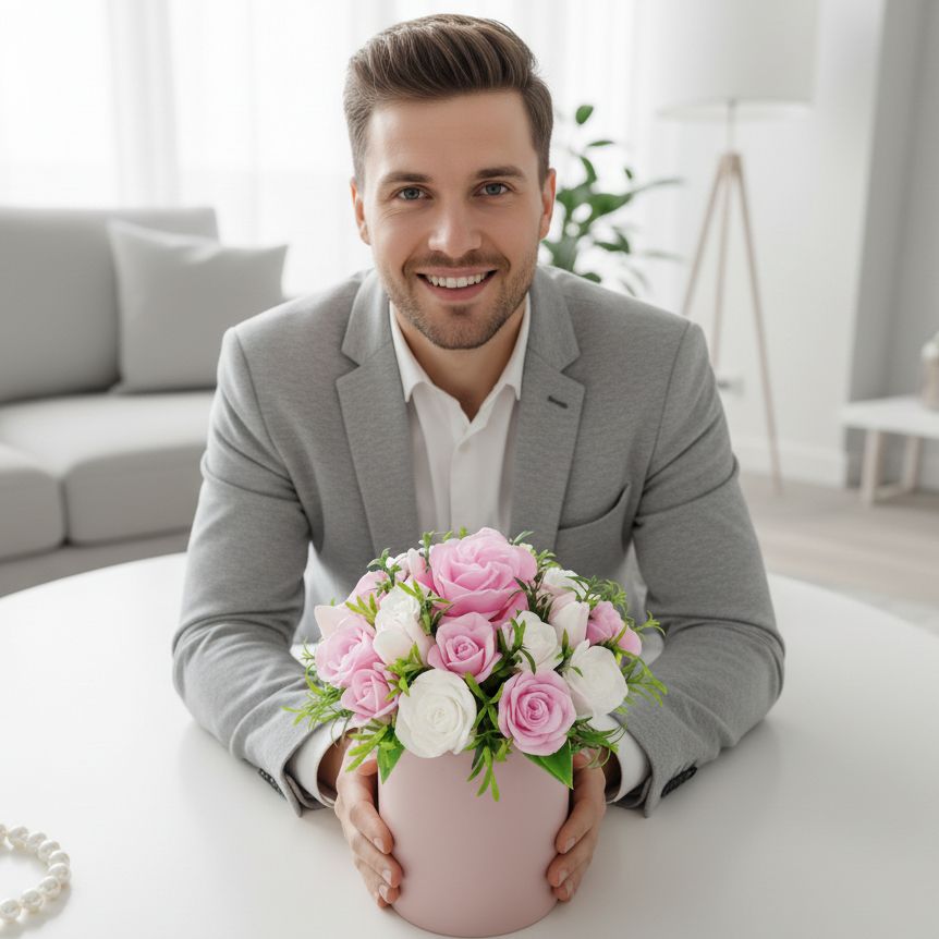 Собранный из нежных розовых и белоснежных роз в высокой шляпной коробке, он символизирует чистую красоту и возвышенные эмоции. Каждый цветок — это шаг к вершине, а весь букет — триумф вашей любви и признательности.