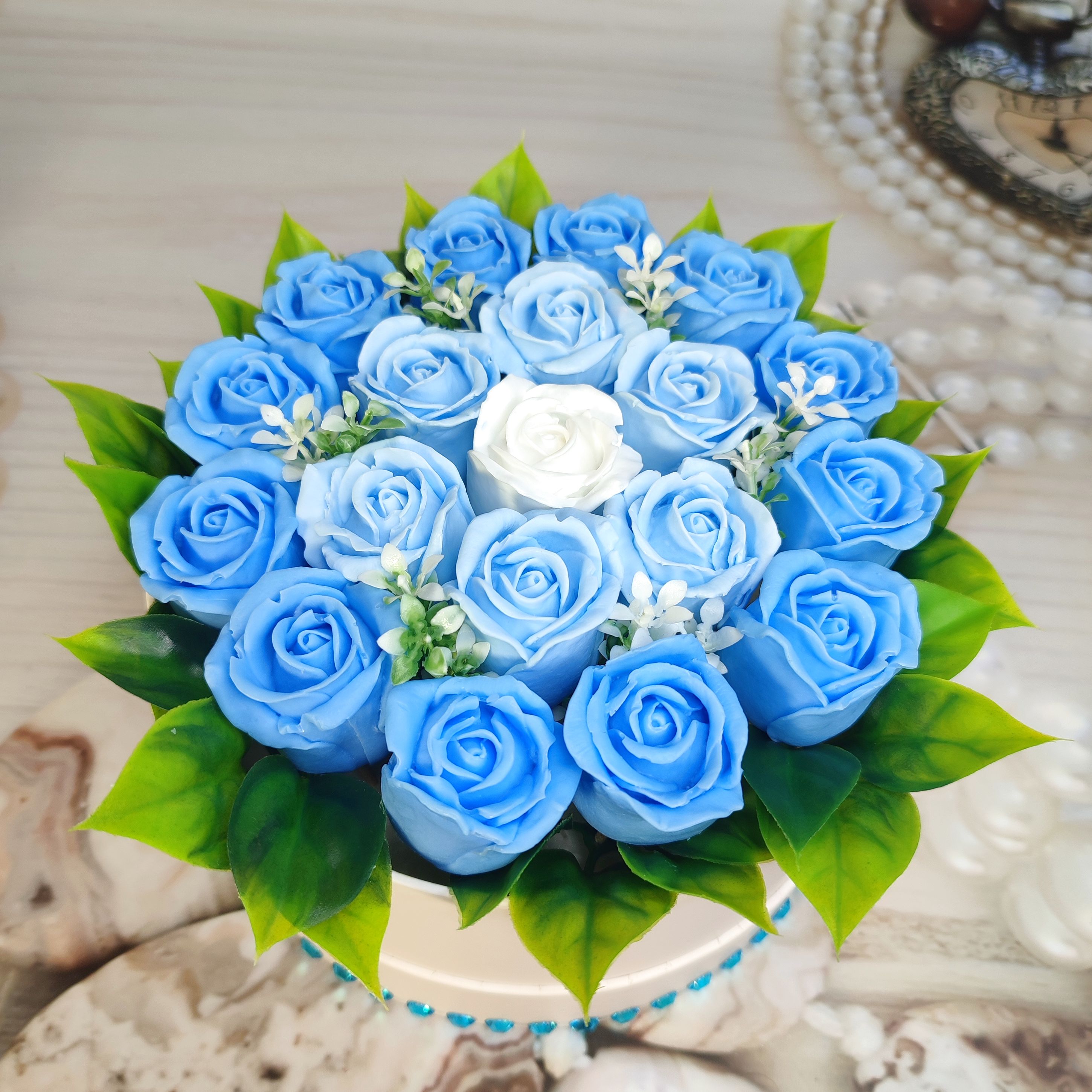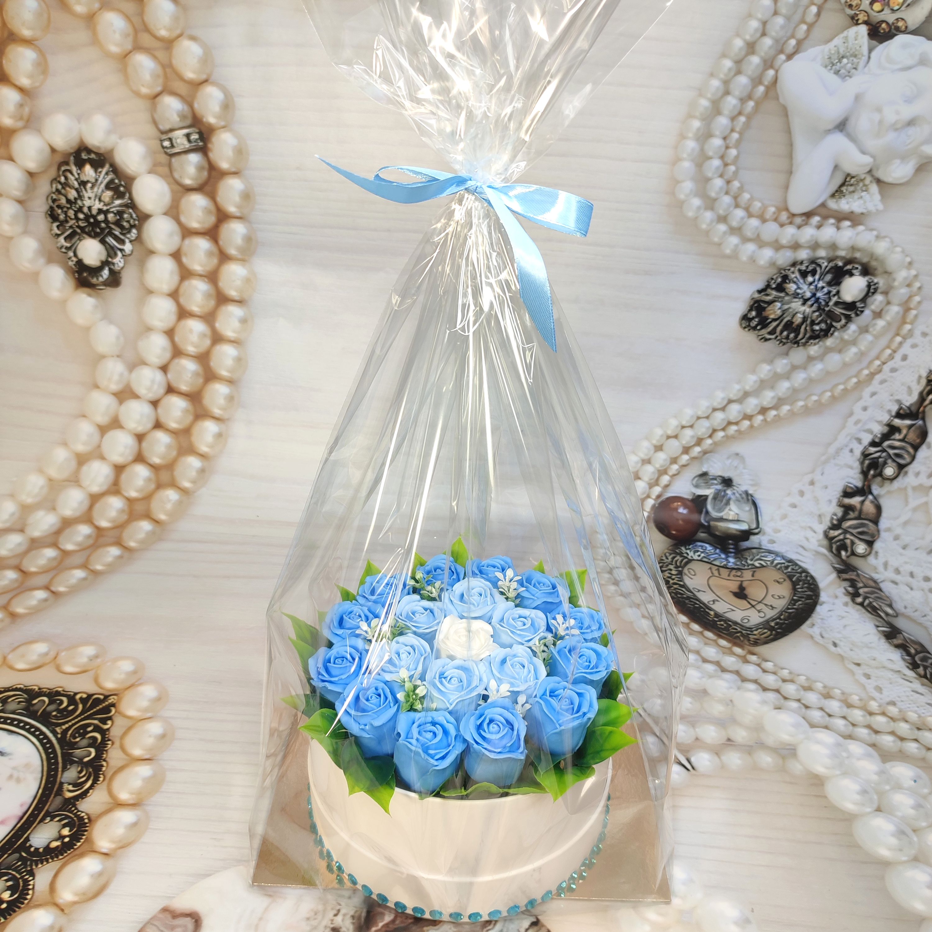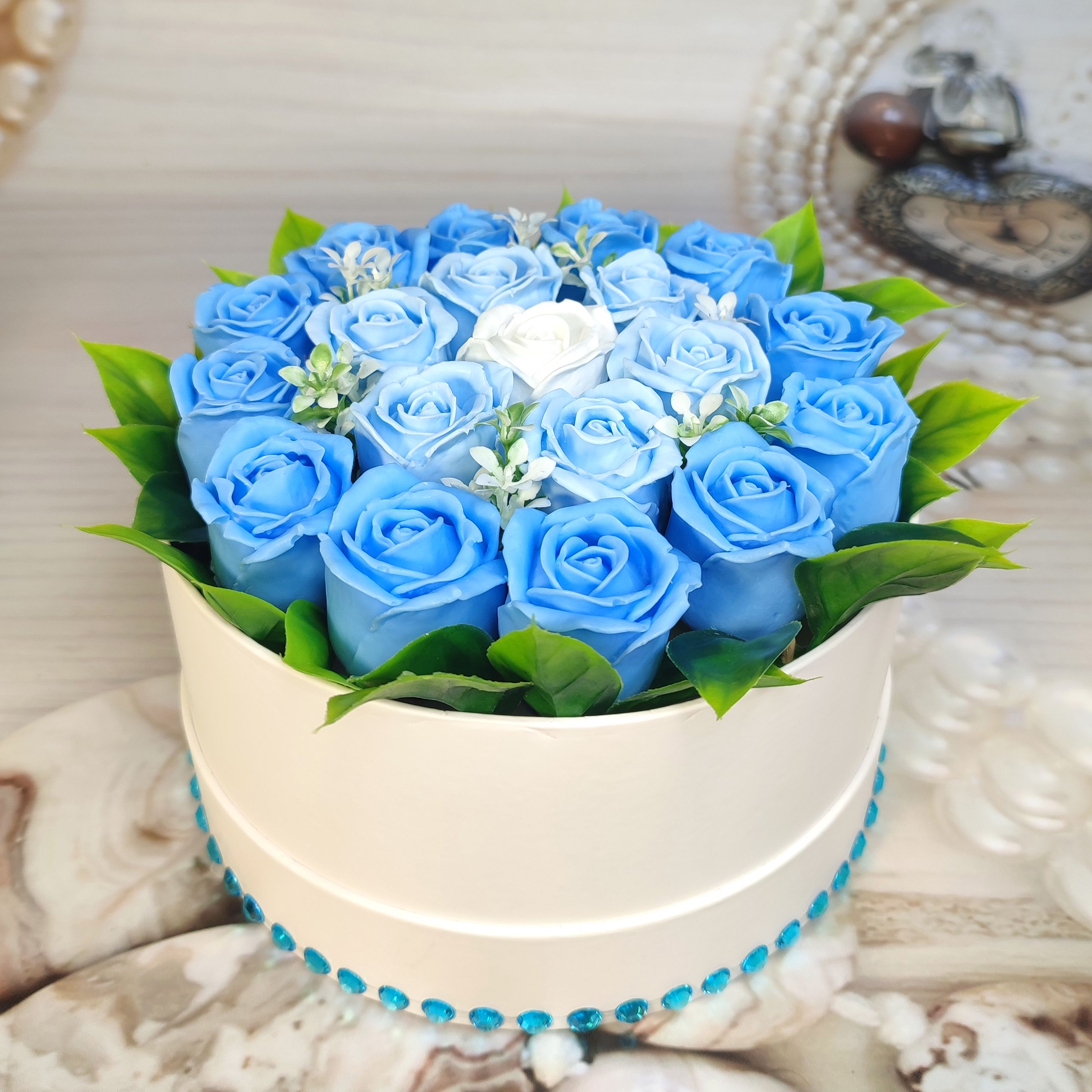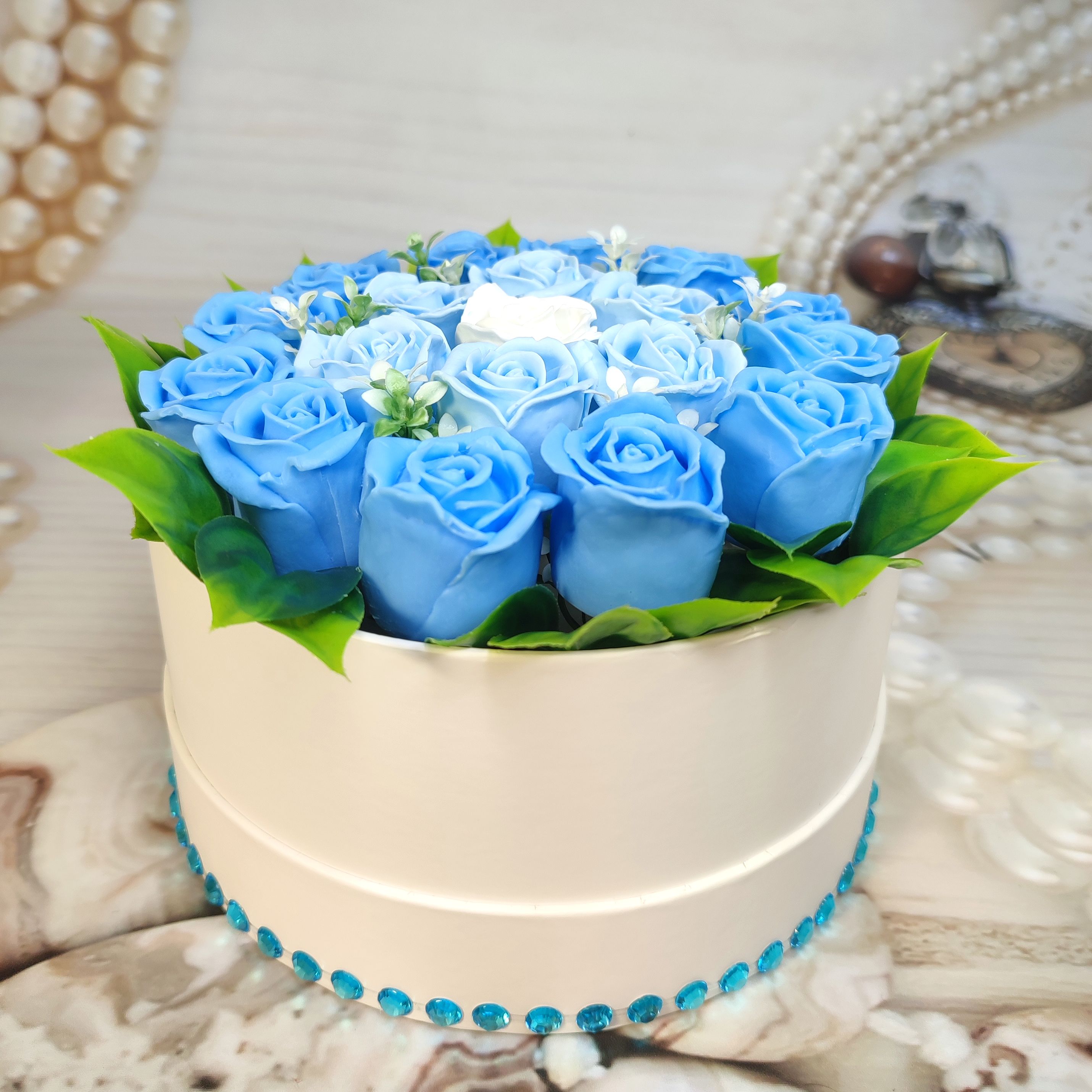 Оригинальный букет из 19 мыльных роз нежных голубых оттенков в шляпной коробке, украшенной стразами.