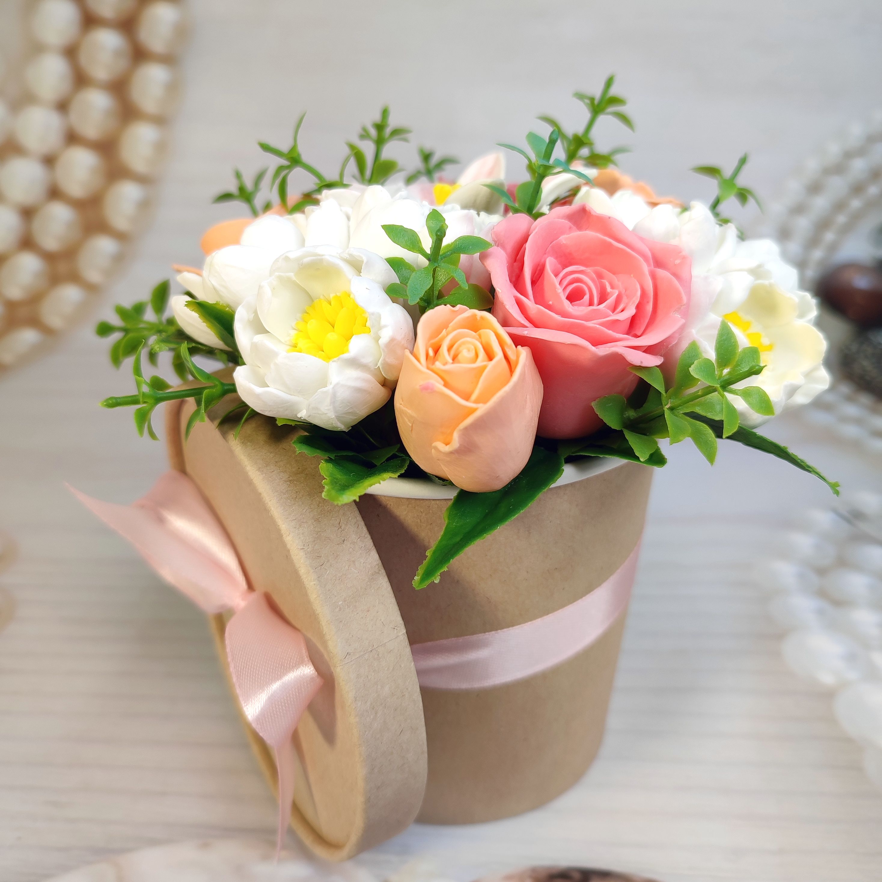 Небольшой букетик из мыльных цветов, приятный недорогой подарок.