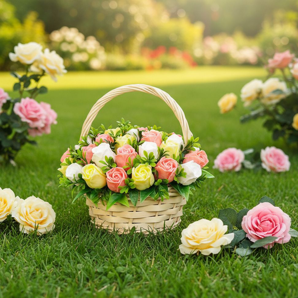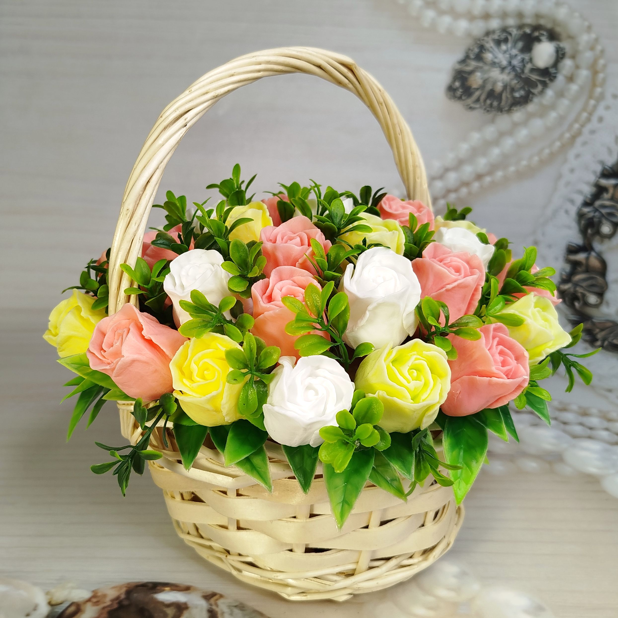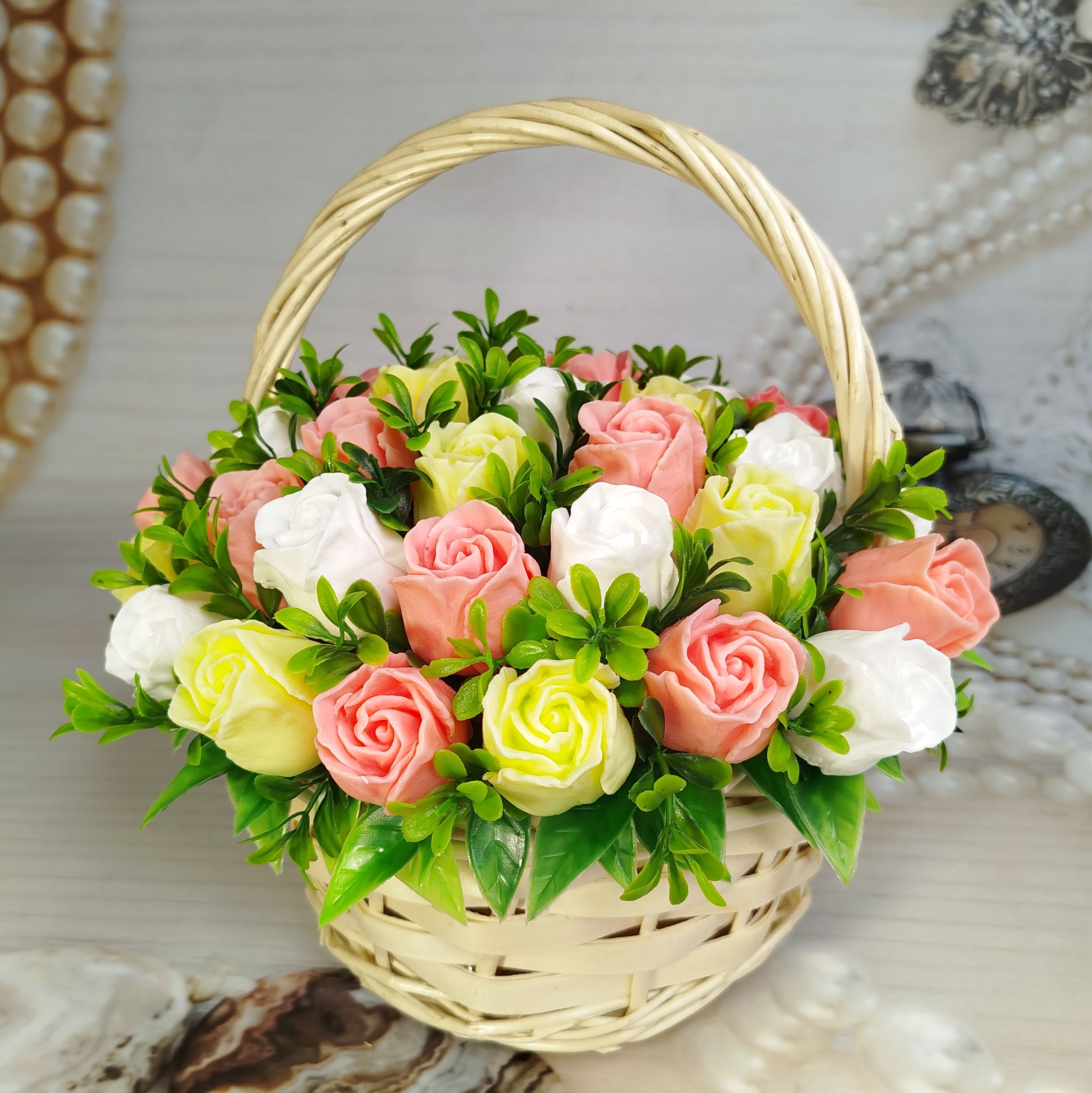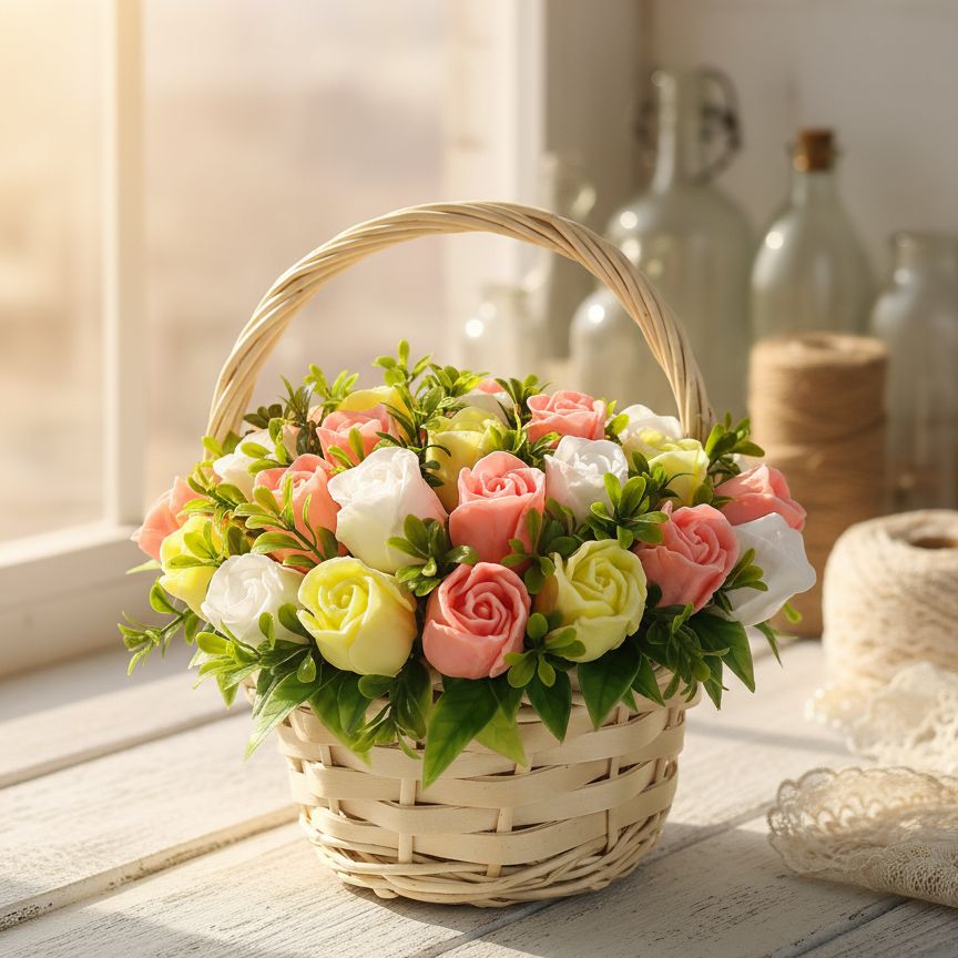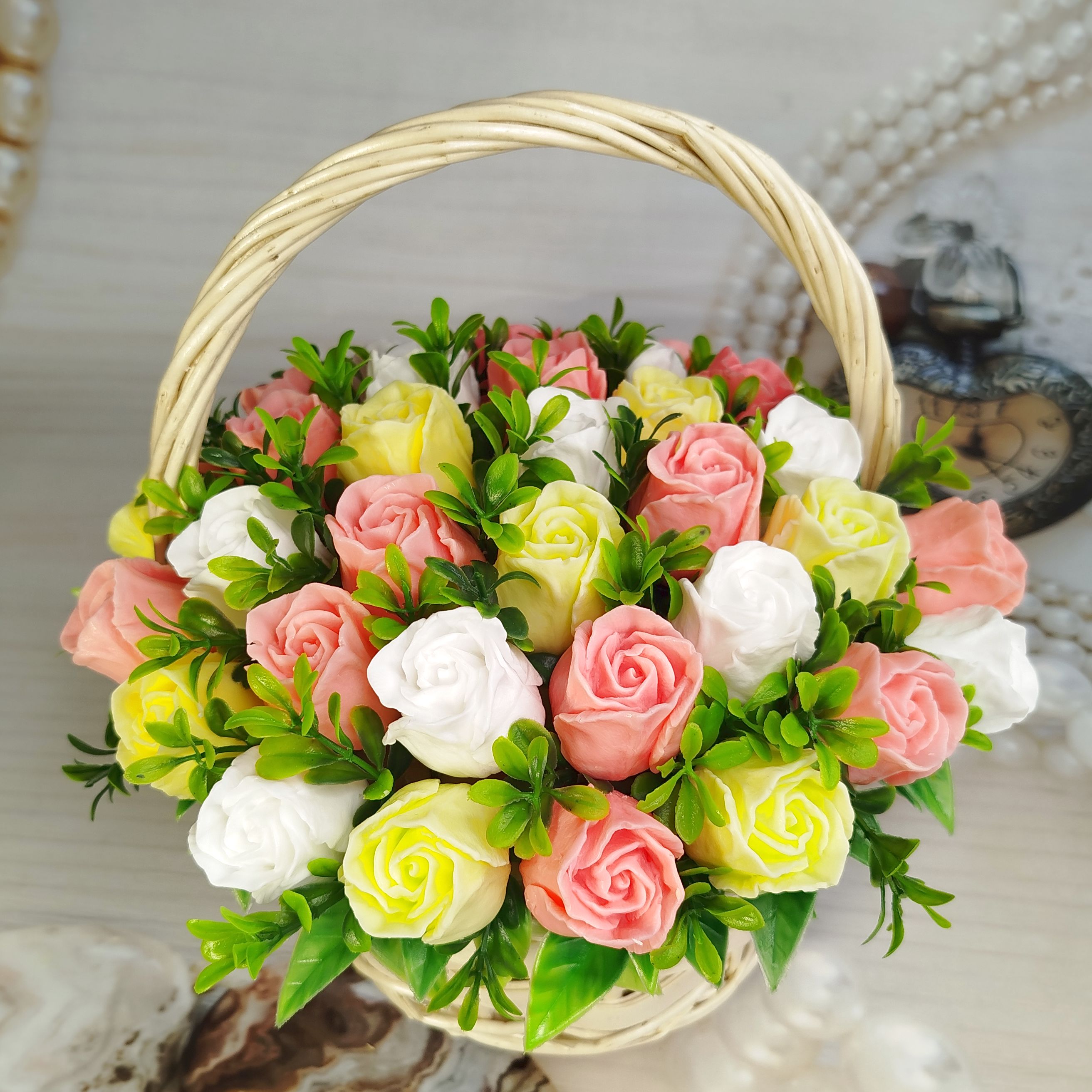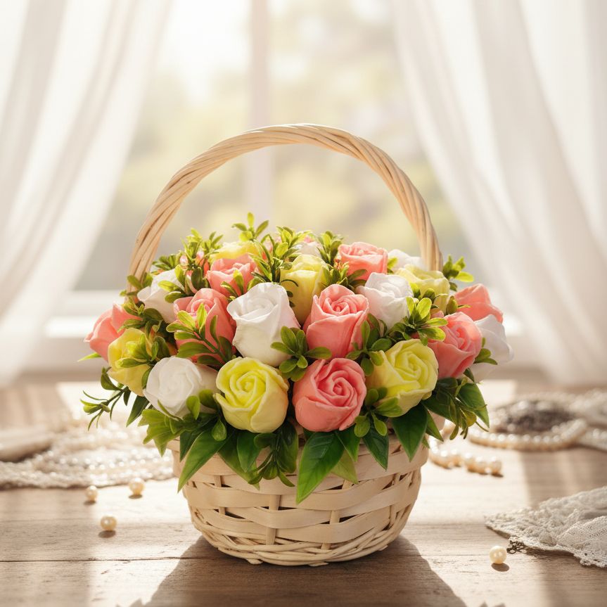"Обыкновенное Чудо" – название, которое говорит само за себя! Эта плетеная корзинка наполнена нежнейшими розовыми, желтыми и белыми розами, которые никогда не завянут. Каждый бутон создан вручную, чтобы дарить красоту и аромат, а после использования – мягкую и душистую пену. Идеальный подарок, который объединяет эстетику и практичность. Пусть маленькие чудеса наполняют каждый ваш день!