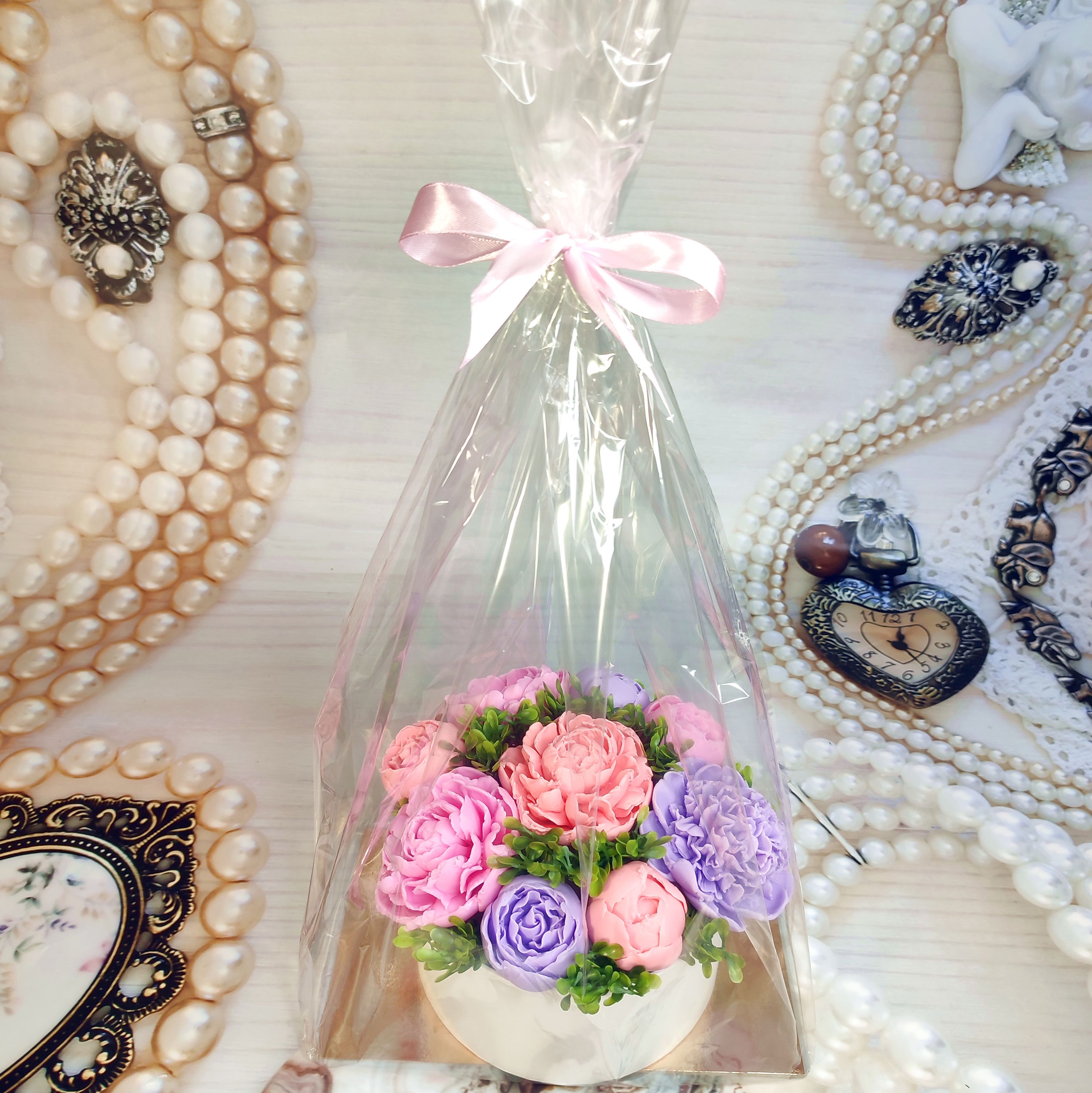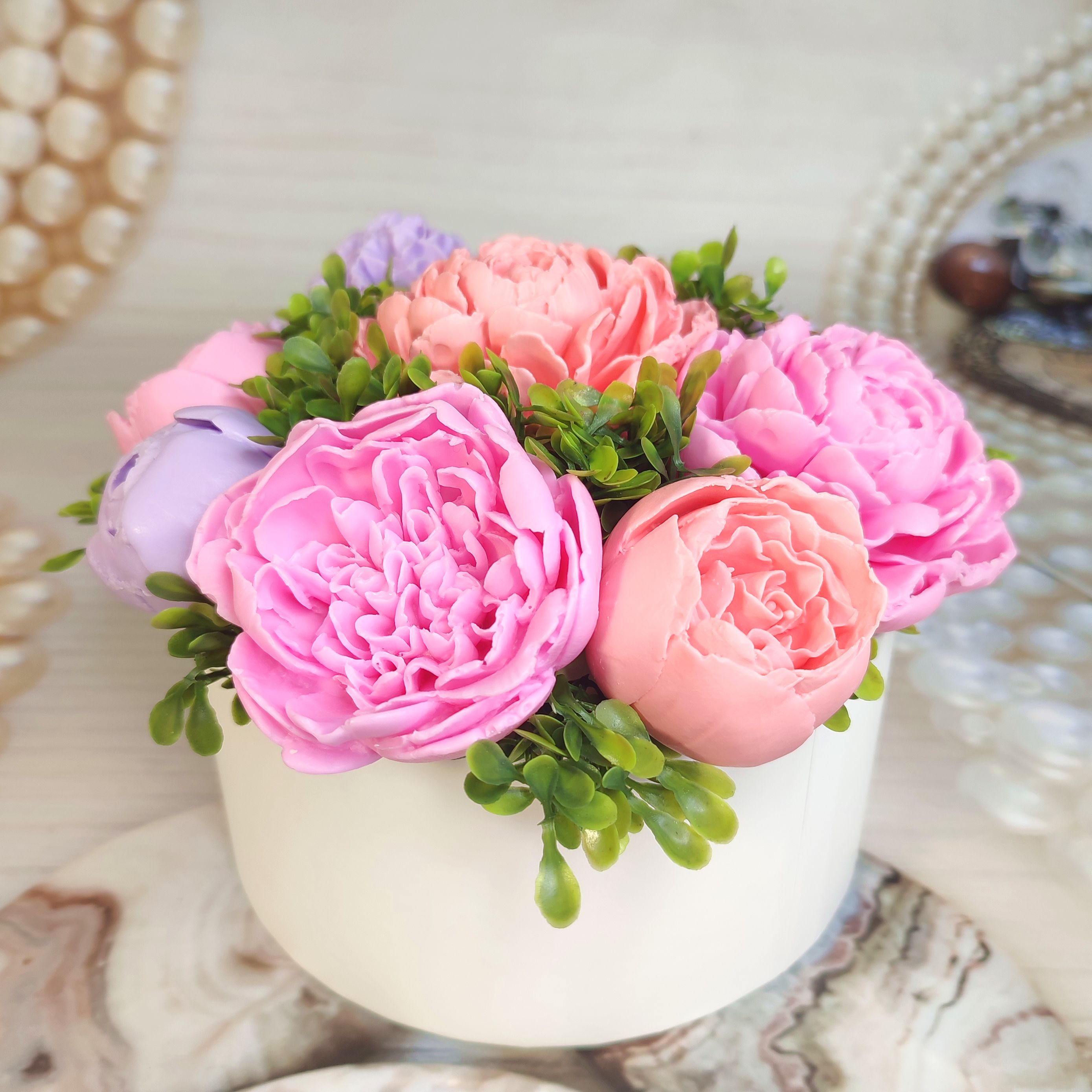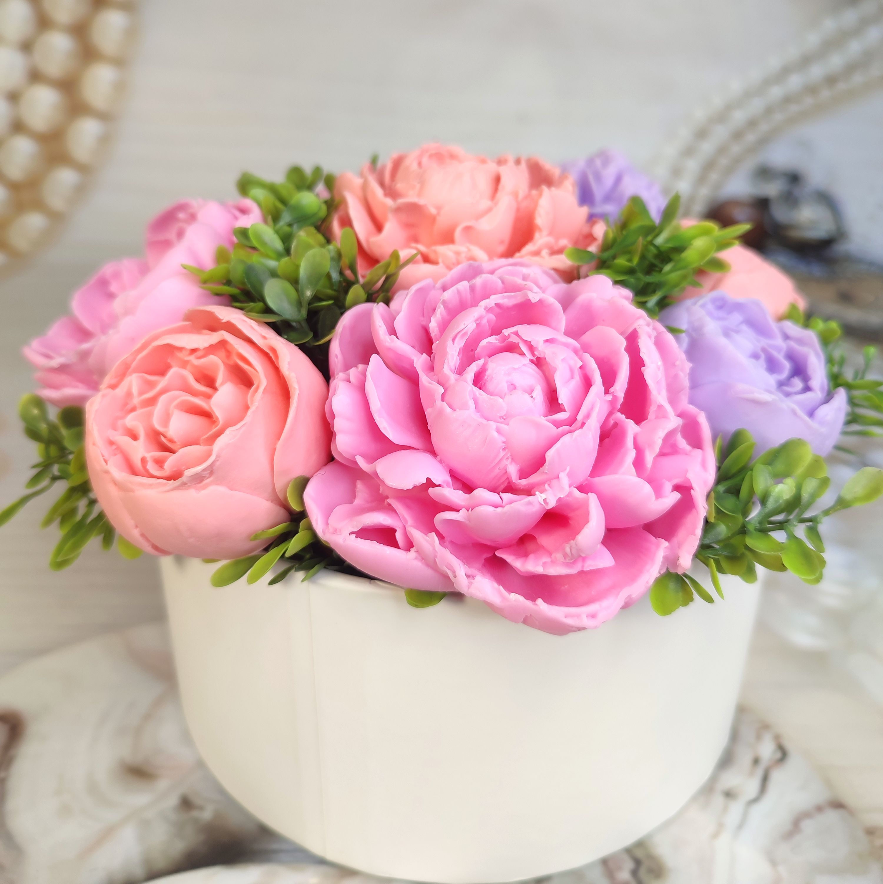Букет из 19 мыльных роз в шляпной коробке со стразами.