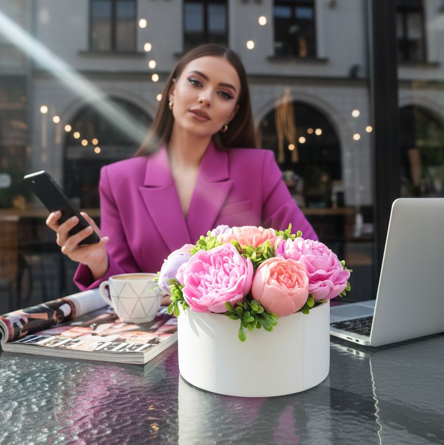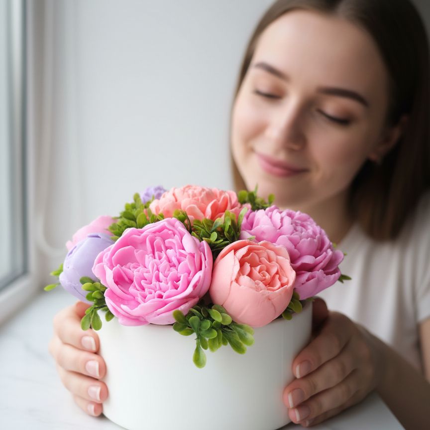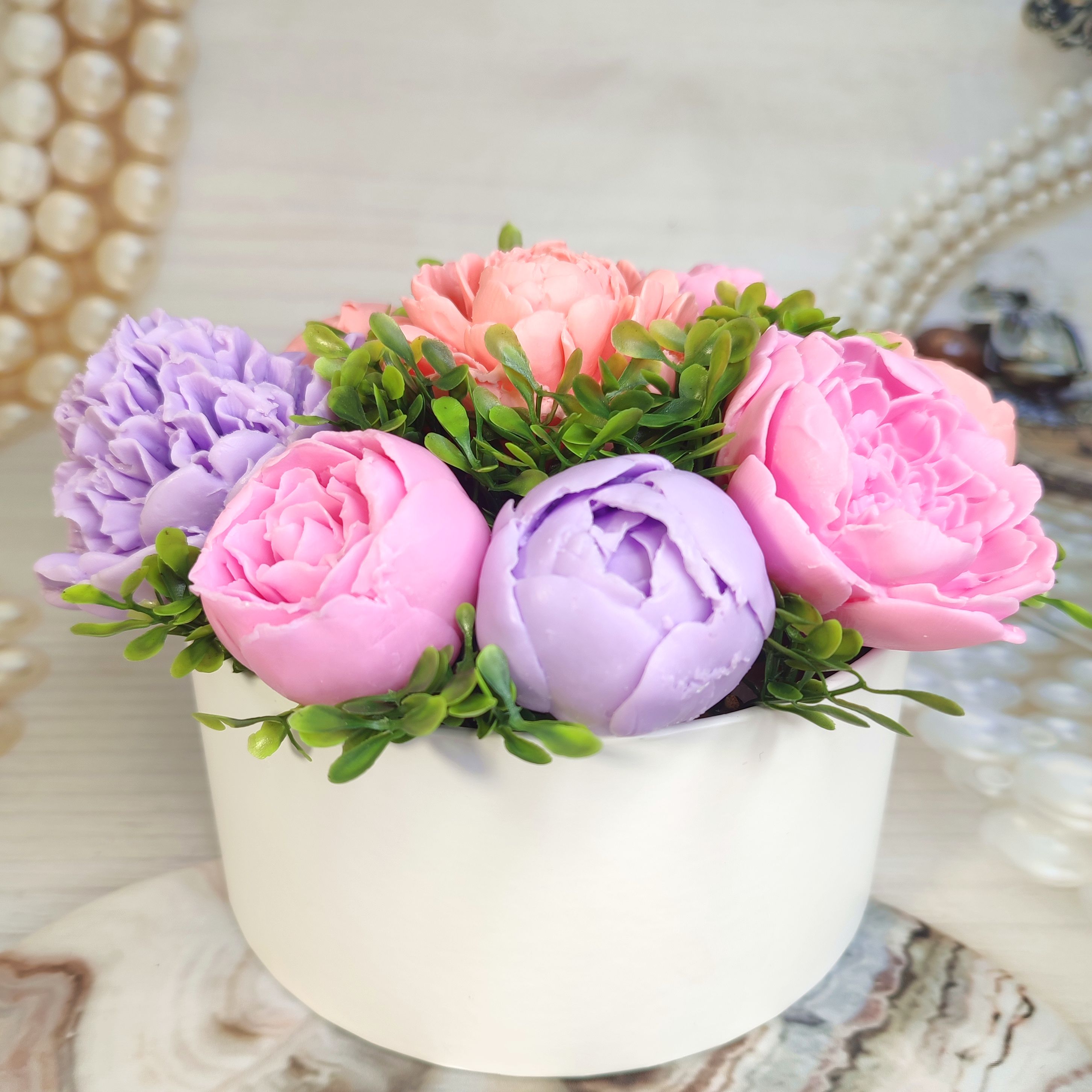 Букет из 19 мыльных роз в шляпной коробке со стразами.