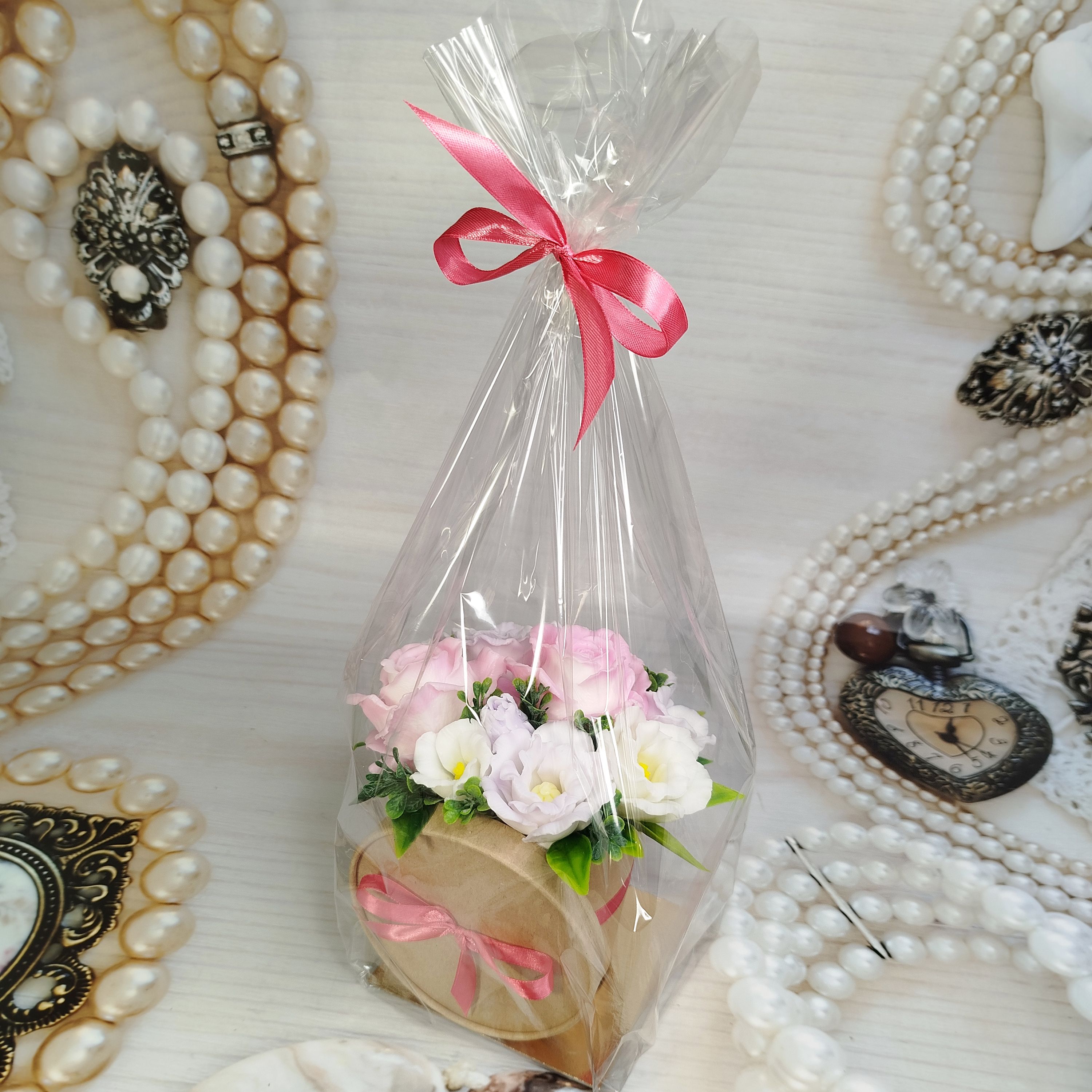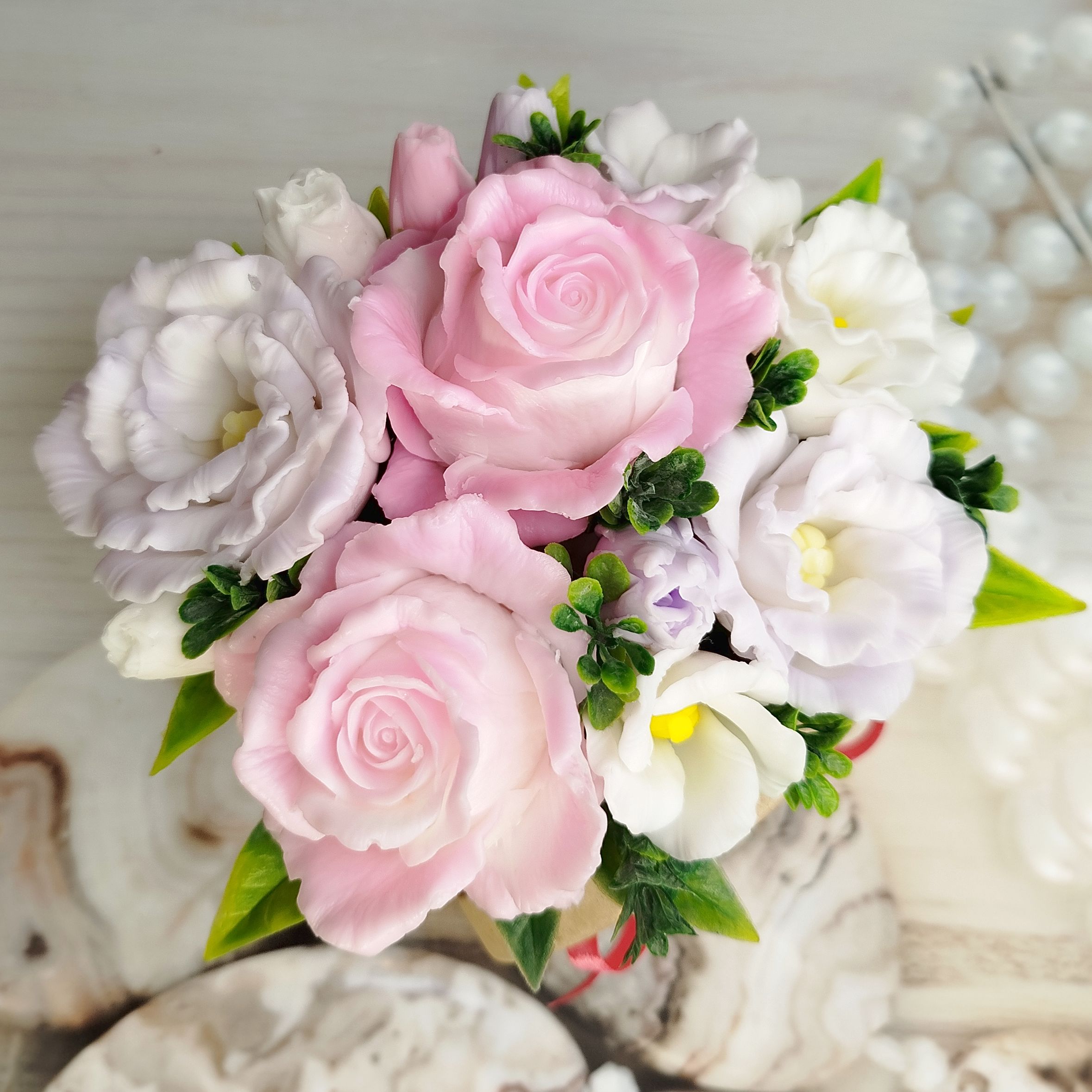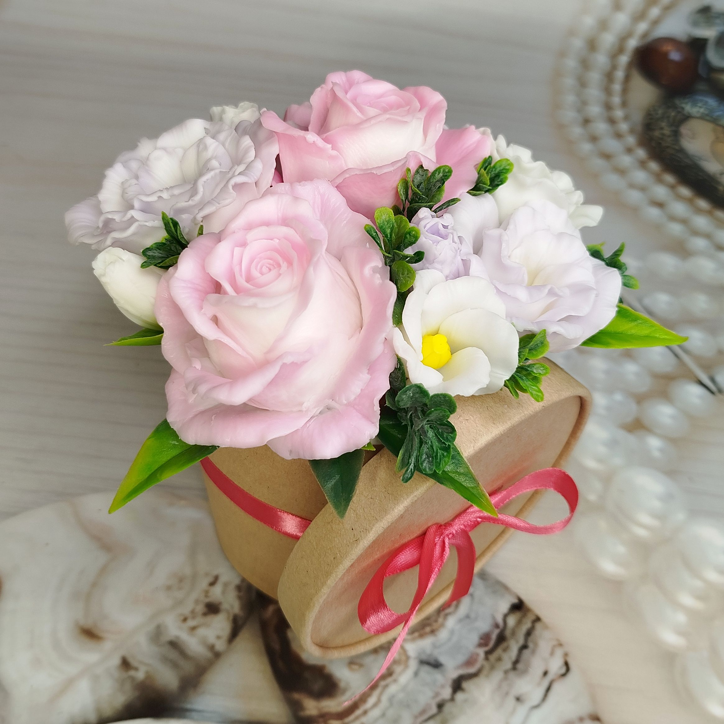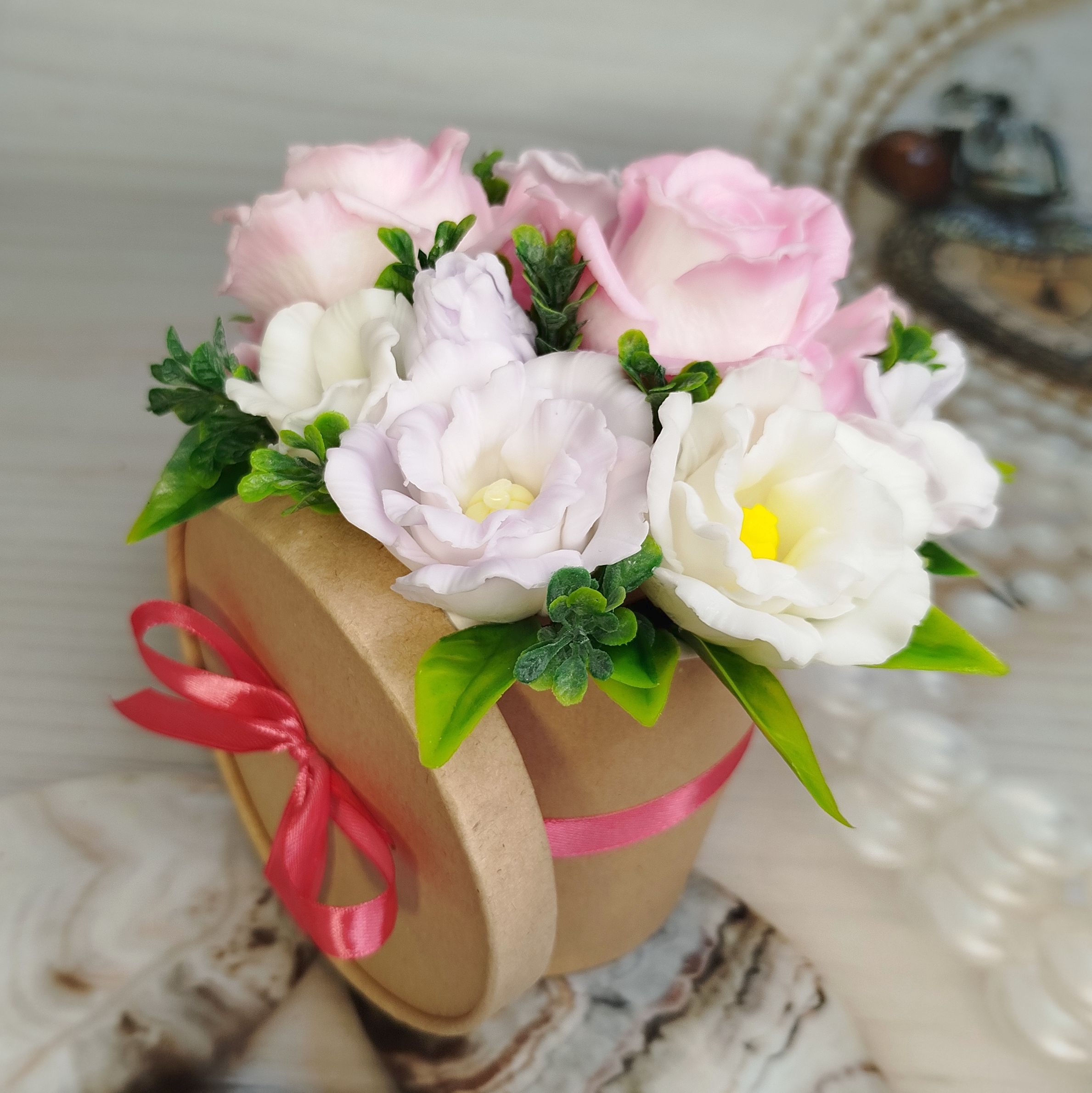 Букет "Розовые сны" - розы и эустомы в крафтовом стаканчике.