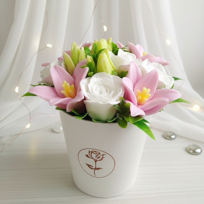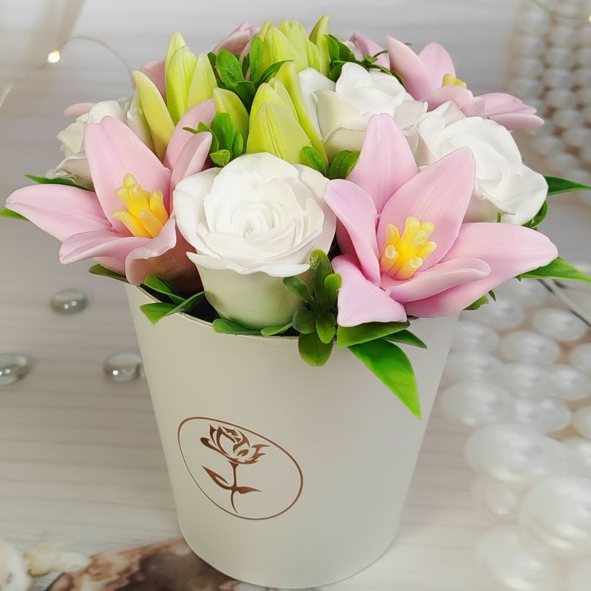 Встречайте "Шёпот лилий" – букет, который покоряет с первого взгляда! Нежные мыльные розы и лилии в одном флаконе. Это не просто цветы, это эмоции, которые можно подарить. Невероятно реалистичные, эти цветы никогда не завянут, даря радость и прекрасный аромат долгое время.
