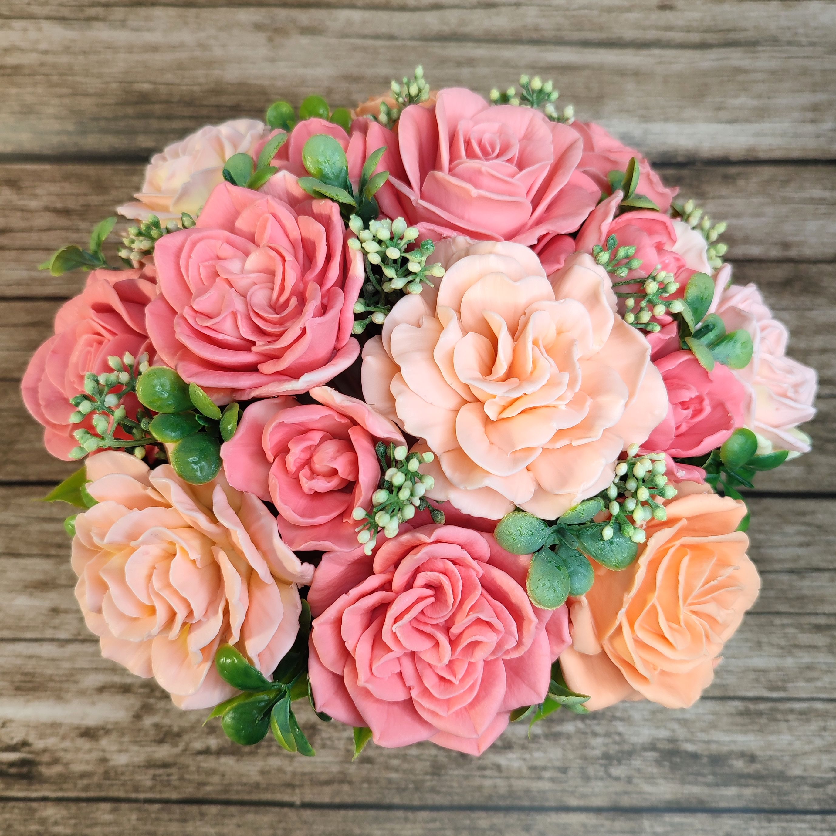 Высота букета примерно 26см, диаметр 25см.