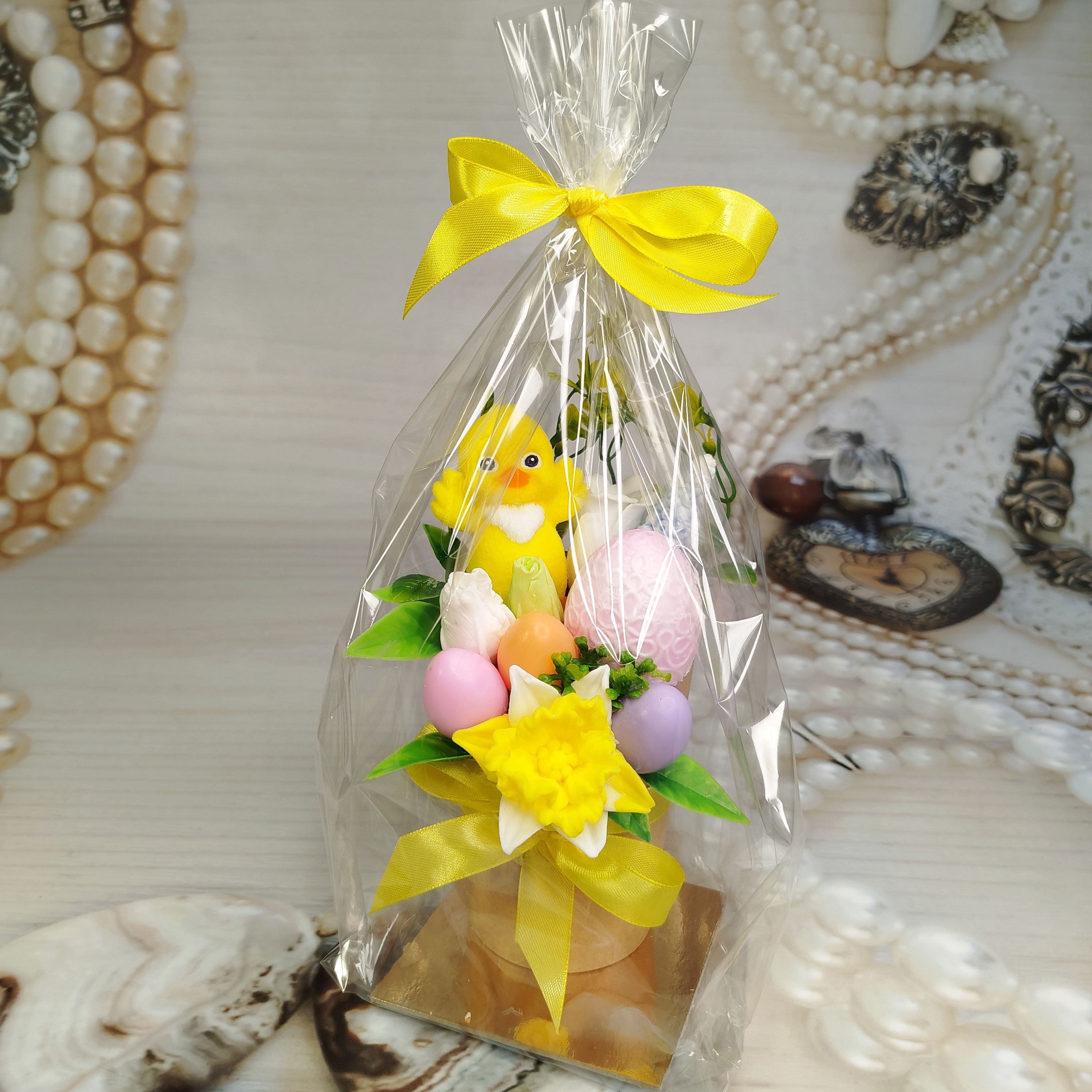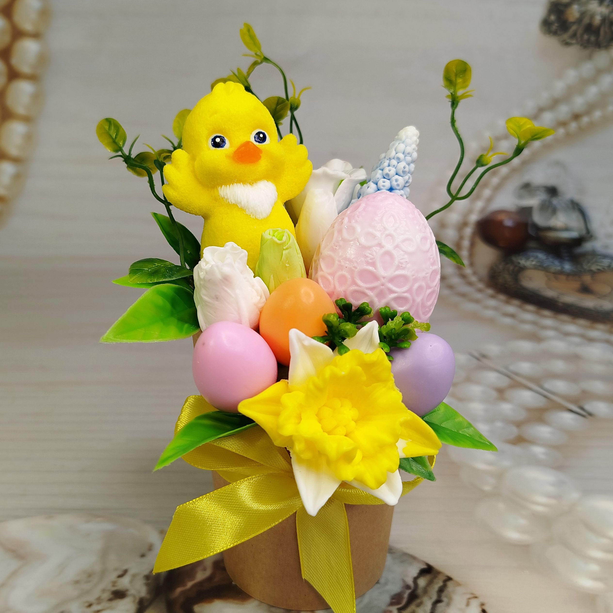 Встречайте светлую Пасху с весенним букетом! Этот милый цыплёнок из мыла, окруженный яркими и ароматными цветами, словно кусочек весеннего сада, принесет в ваш дом радость и солнечное настроение. Подарите близким символ тепла и обновления! Почувствуйте радость Пасхи!