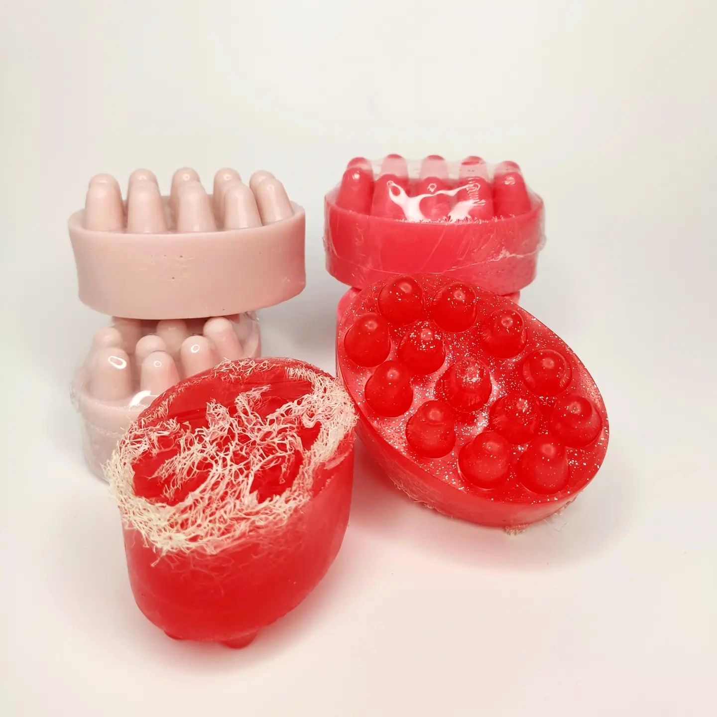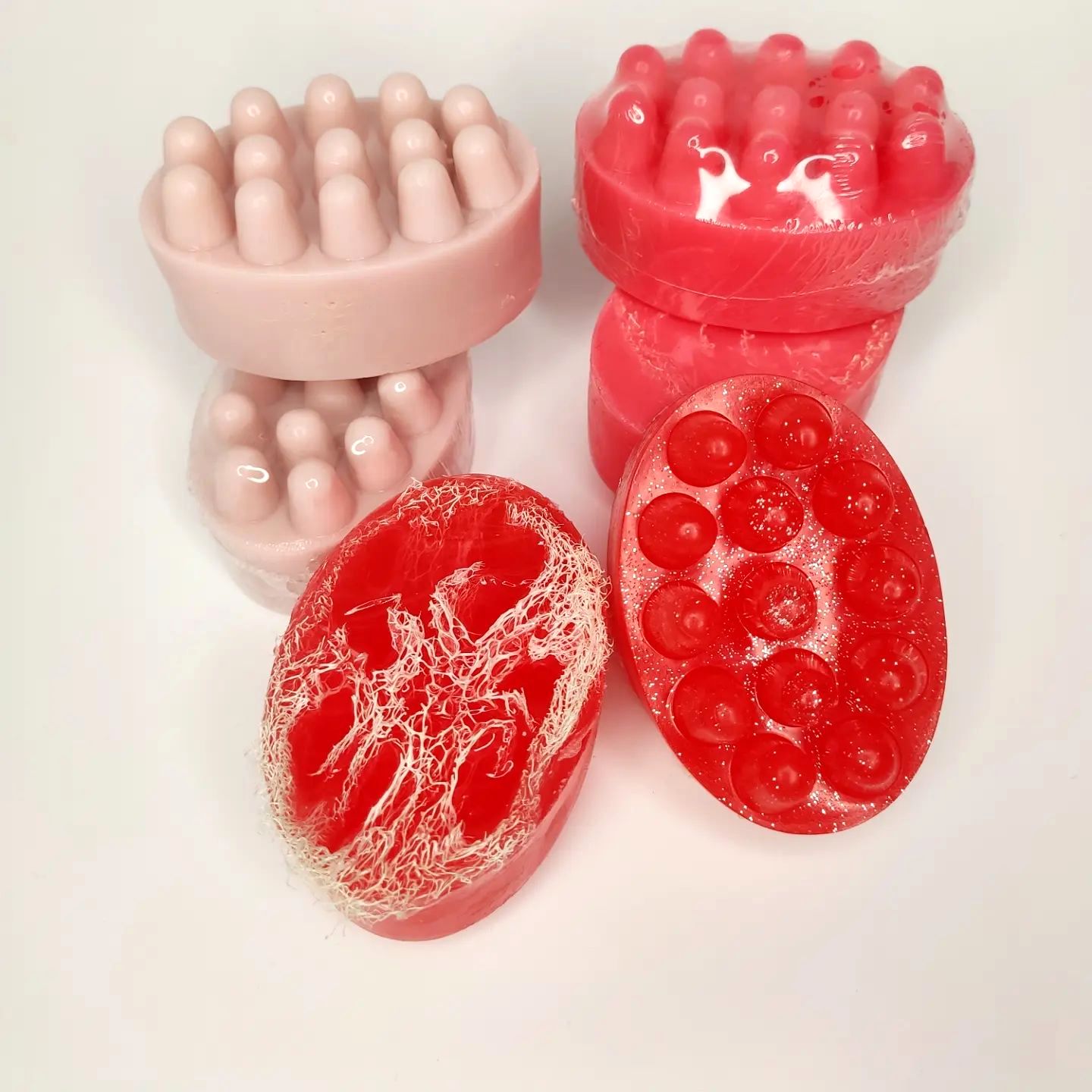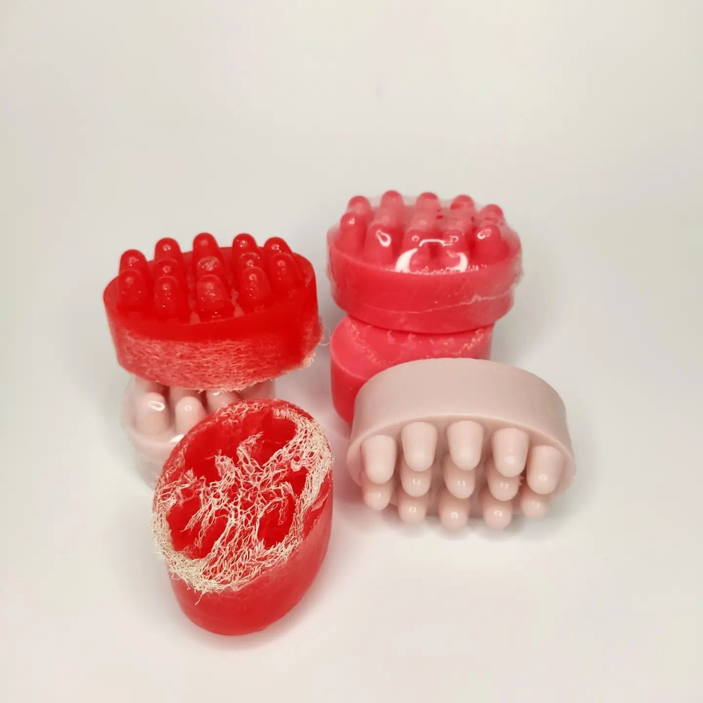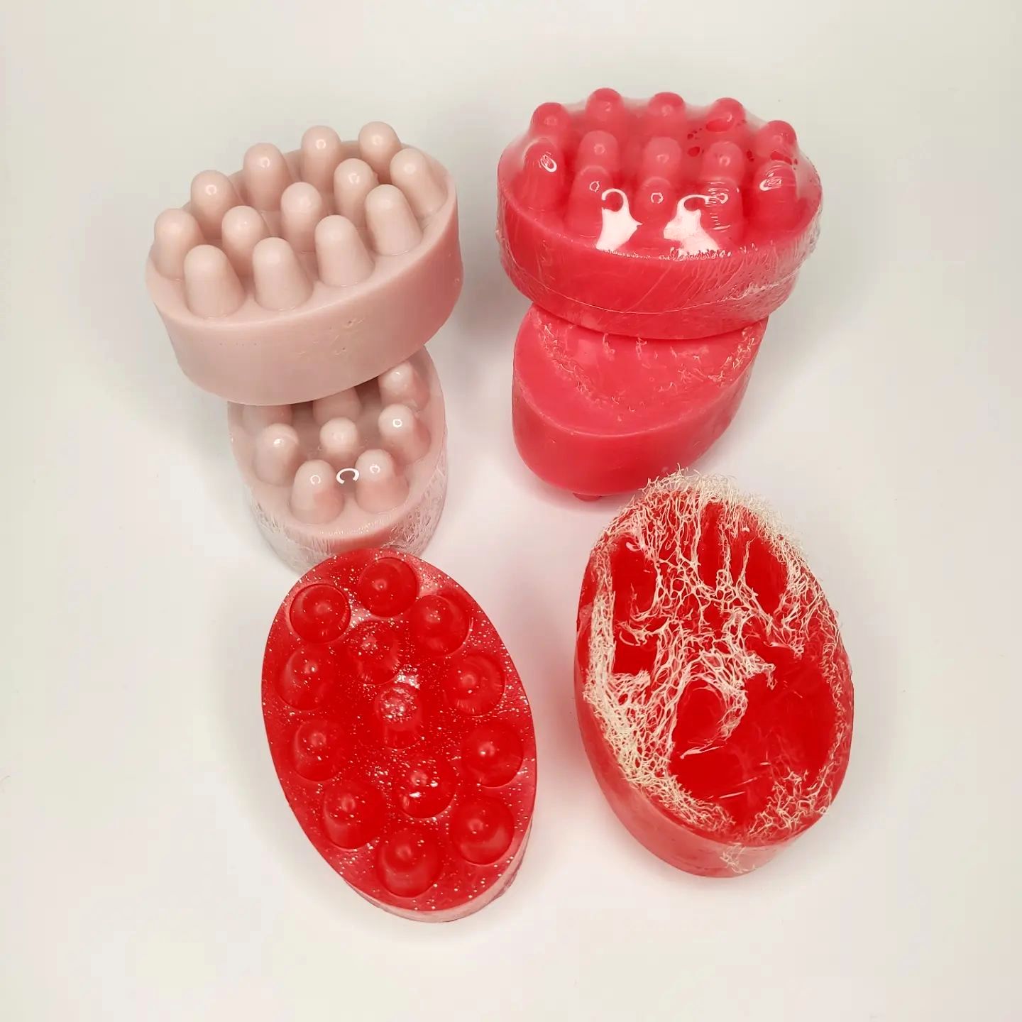 Применение массажного мыла с люфой: изначально намылиться массажной стороной мыла, а затем уже, размягченной под теплой водой стороной с люфой проработать нужные участки тела.