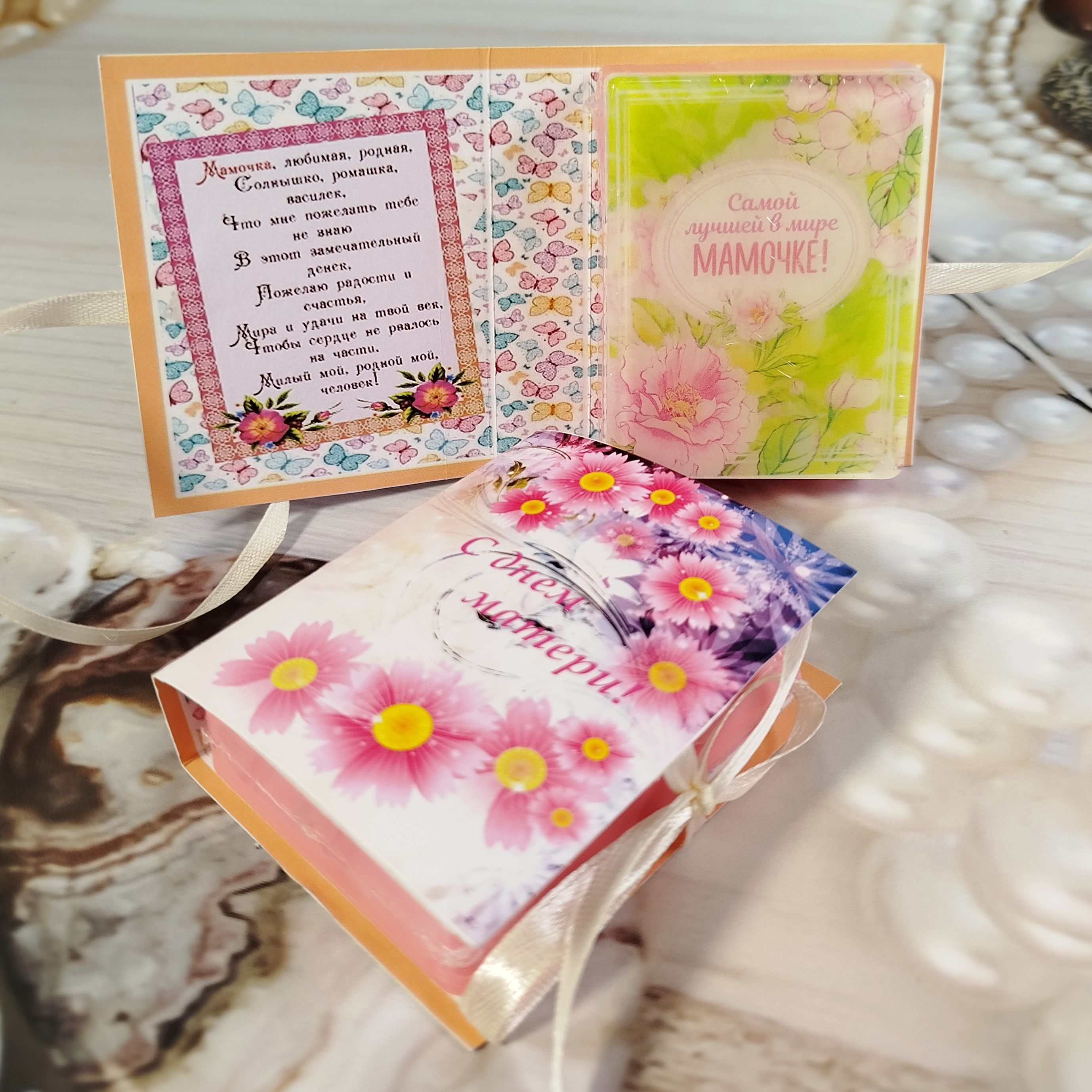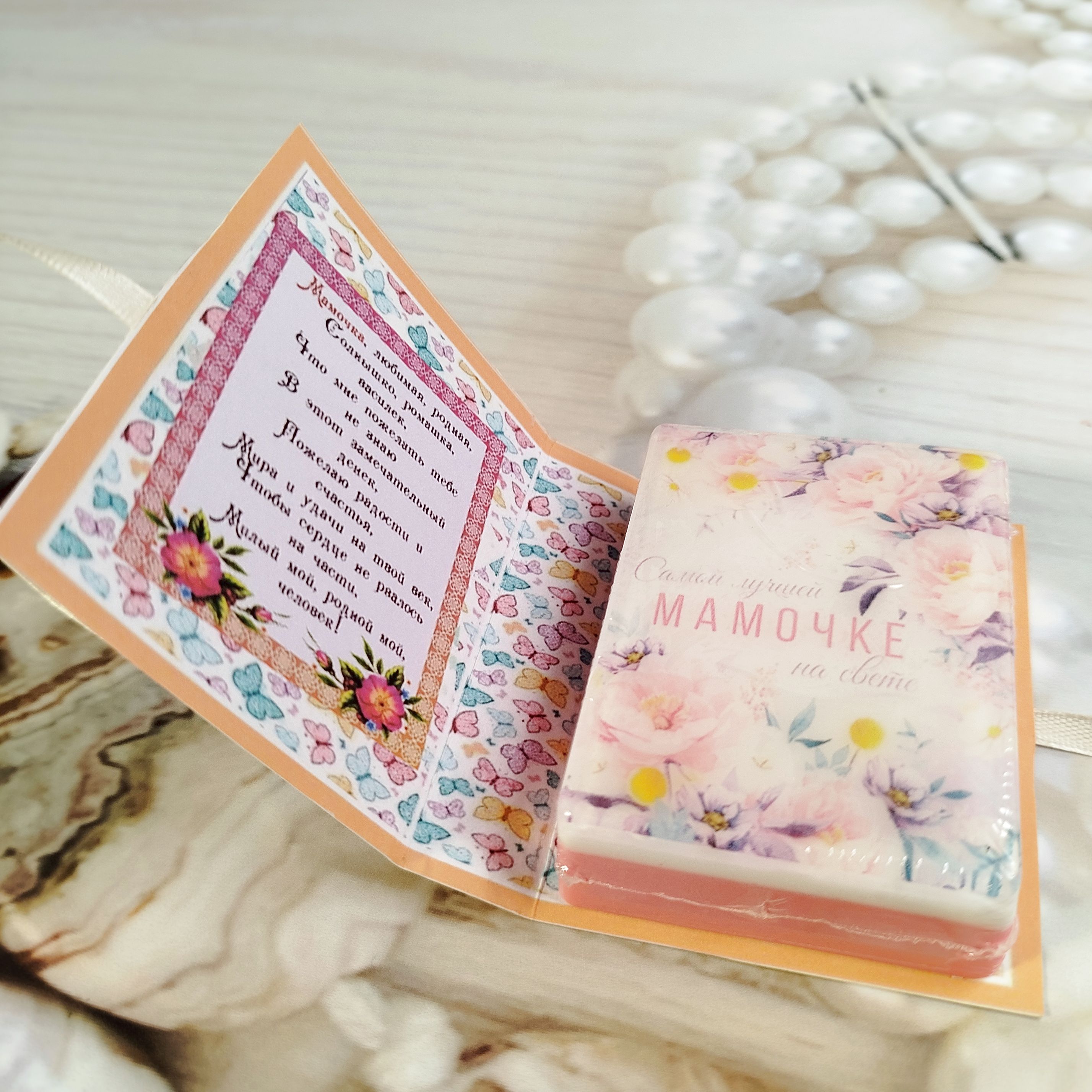 Мыло с поздравлением, оригинально оформленное в виде открытки.
